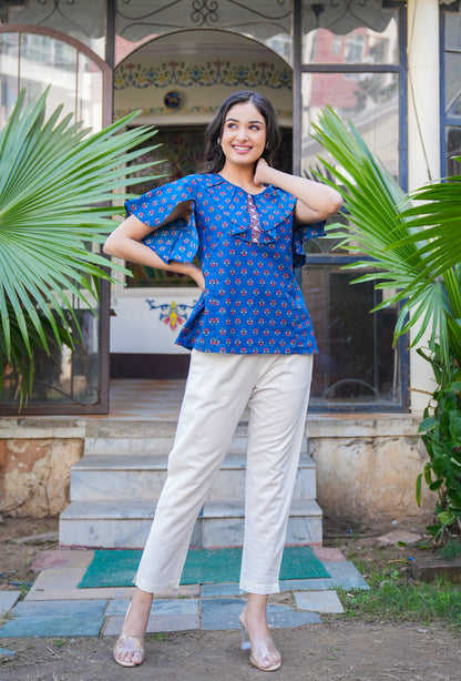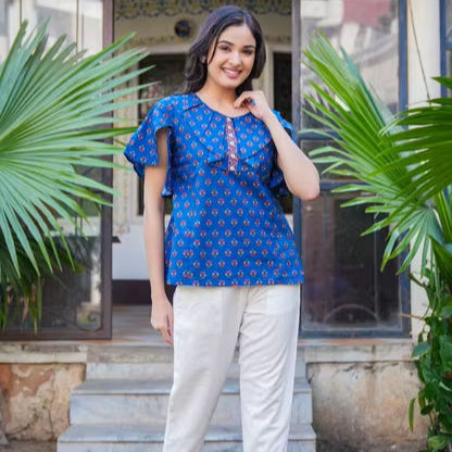 Blue Cotton Floral Printed Women's Summer Kurta Casual Ethnic Daily Wear Comfortable Breathable Quick Dry Stylish