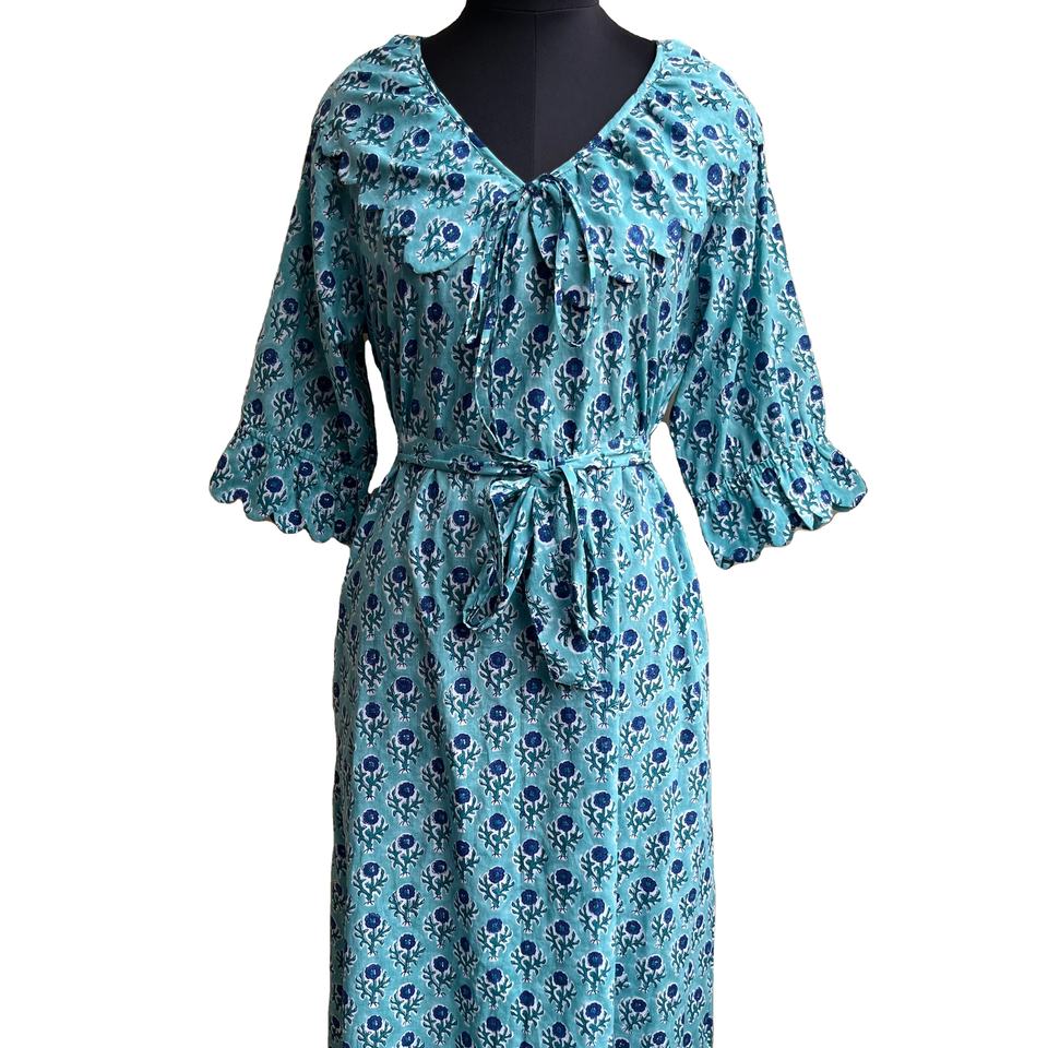 Blue Cotton Hand Block Midi Dress, Mini Dress, Floral Long Block Print Dress, Deep Neck with string closer Gift for her
