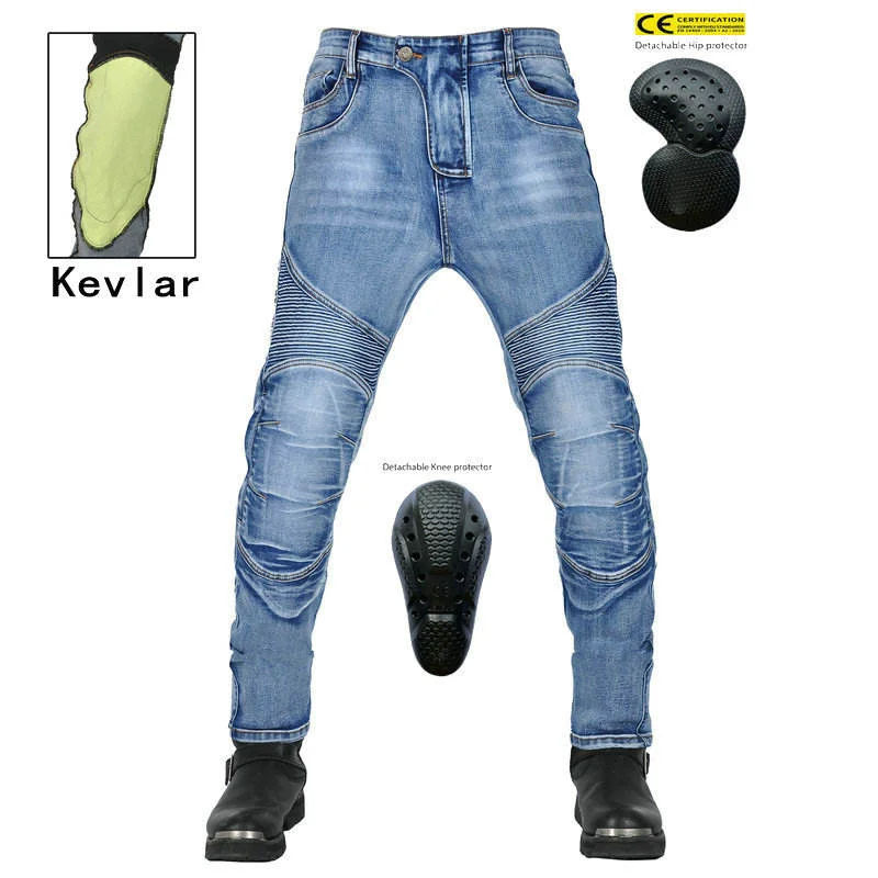 กางเกงยีนส์นักขี่มอเตอร์ไซค์ผู้ชายสีน้ำเงิน พร้อมเกราะป้องกัน CE ทนไฟ ระบายอากาศ แห้งเร็ว เพิ่มความปลอดภัยและความสบาย