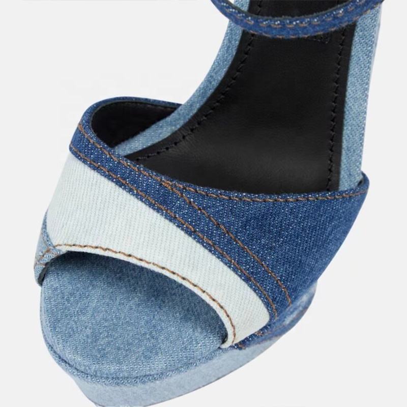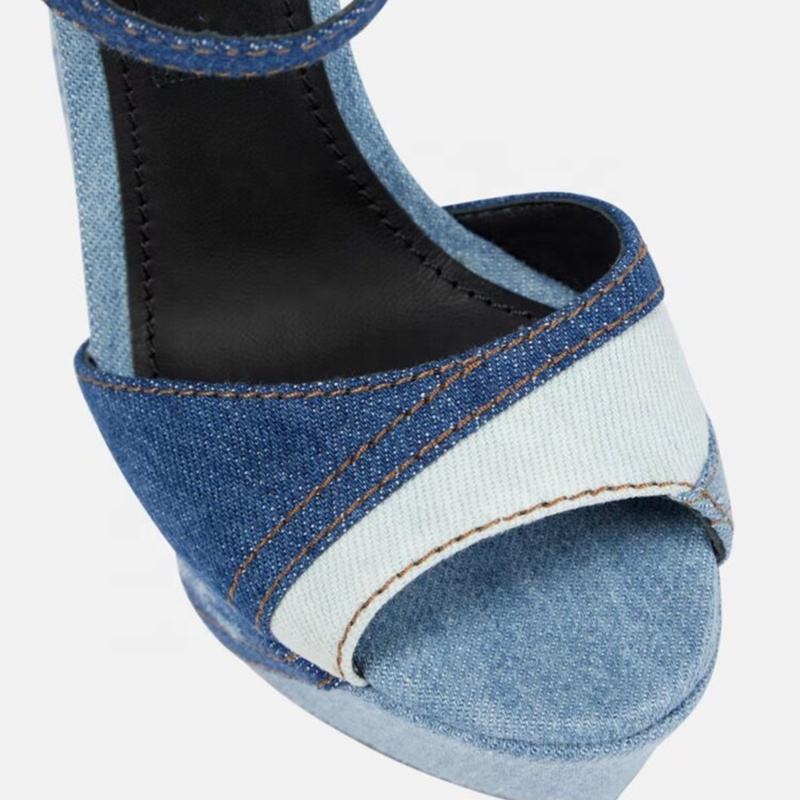 รองเท้าส้นตึกแบบแพทช์เวิร์คสีน้ำเงินเดนิมสำหรับผู้หญิง ส้นหนา สายรัดข้อเท้า เปิดนิ้วเท้า รองเท้าฤดูร้อน