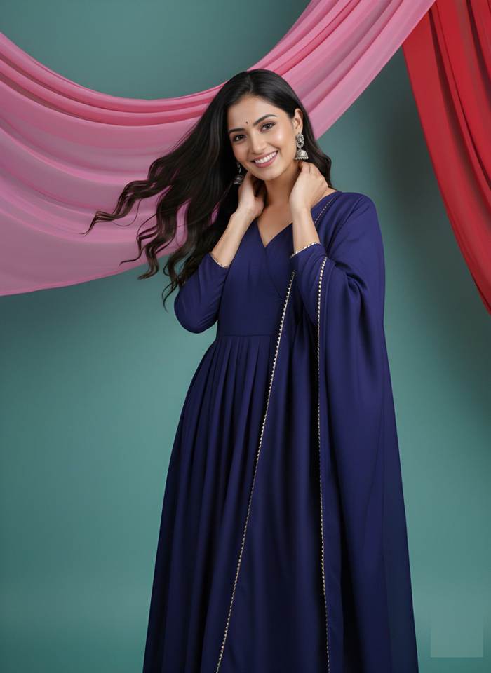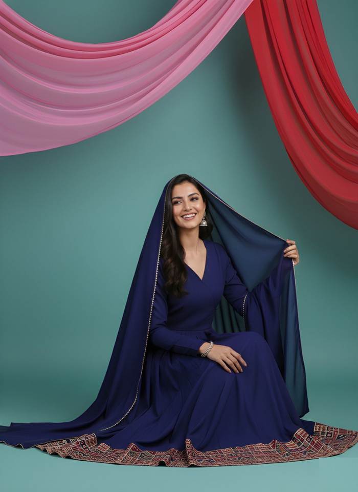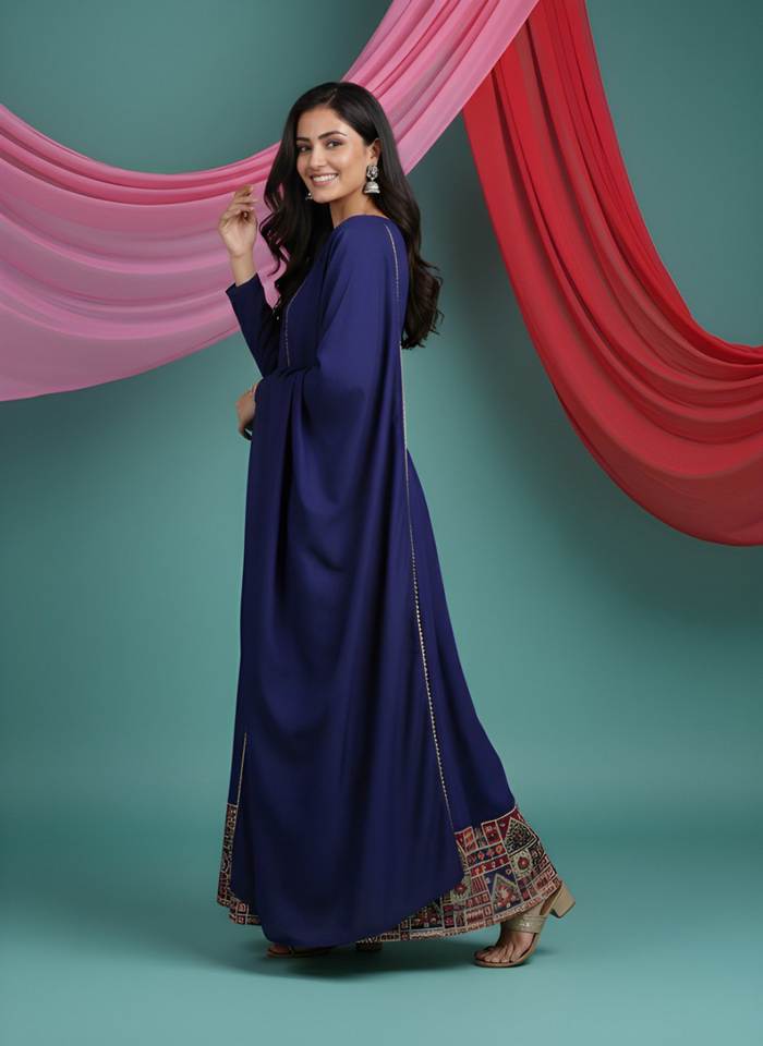 ชุดคุรตะผ้าไหมวิชิตร้าปักลายสีน้ำเงิน พร้อมผ้าคลุมไหล่สำหรับผู้หญิง ตัดเย็บสำเร็จ ความยาวเต็มตัว ขายส่ง มีสินค้าพร้อมส่ง