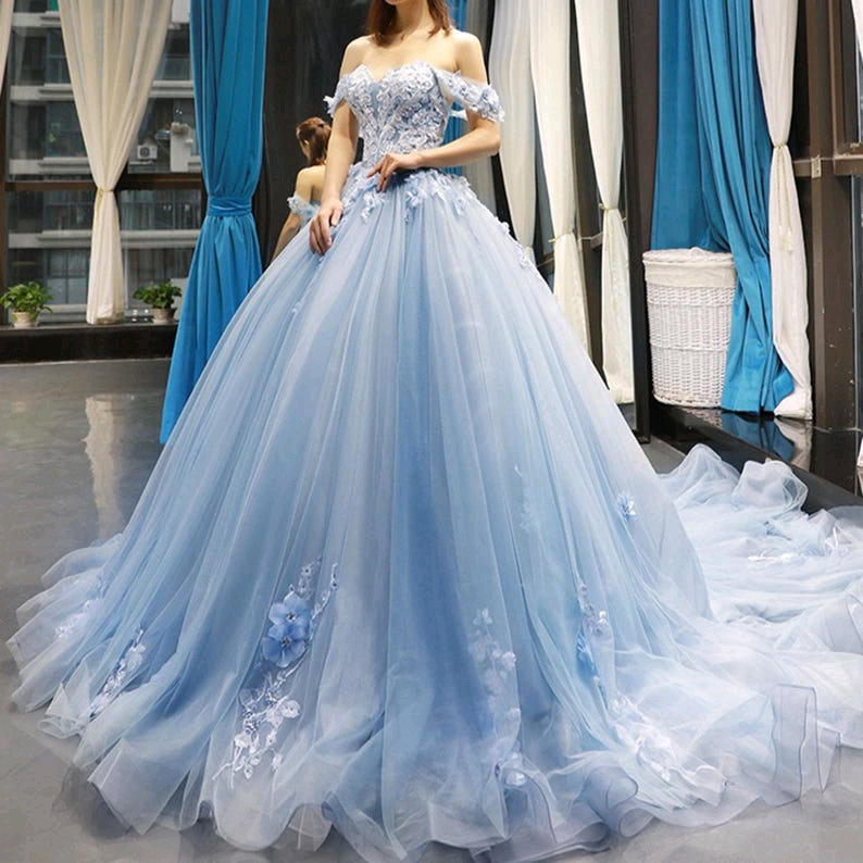ชุดราตรีนางเงือกยาวถึงพื้นหรูหราสีฟ้าสำหรับงานพรอมงานปาร์ตี้ค็อกเทลประดับลูกปัดพลอยเทียมผ้าทูลไหล่ฟูฟ่อง