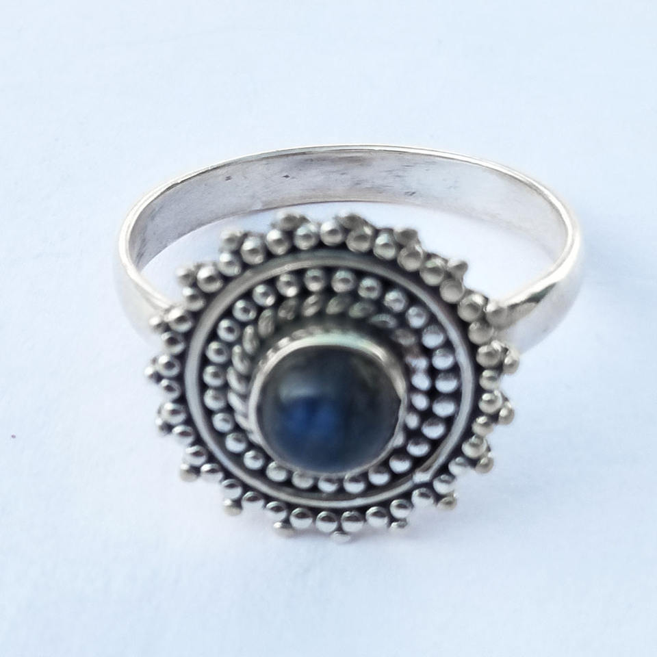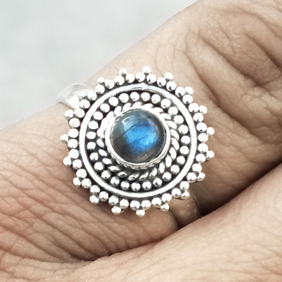 แหวนพลอยลาบราดอไรต์ไฟสีน้ำเงิน925เงินแท้เป็นหนามเตยเครื่องประดับสำหรับวันเกิดของผู้หญิง