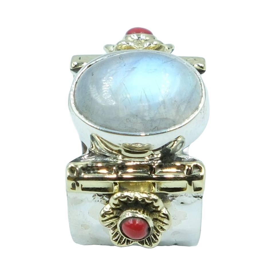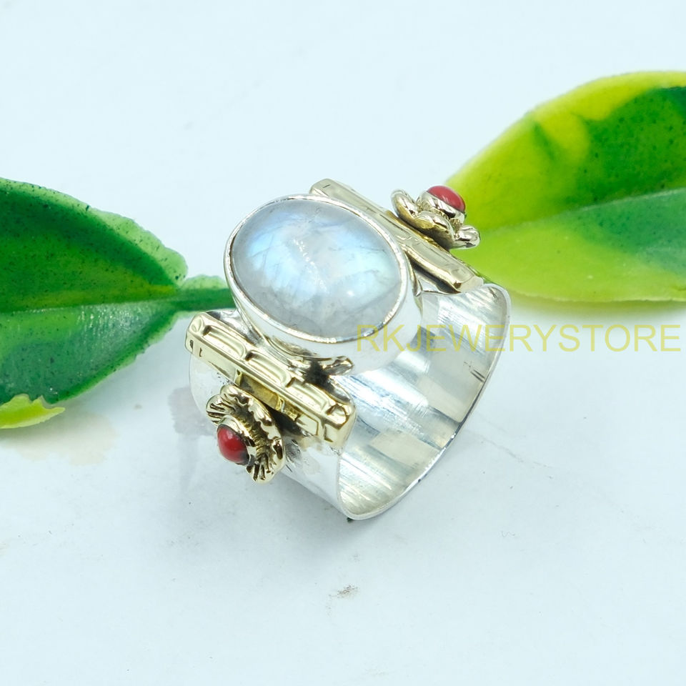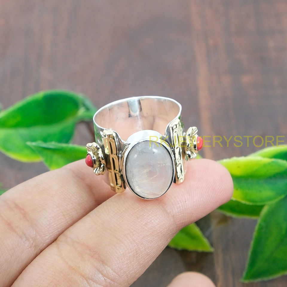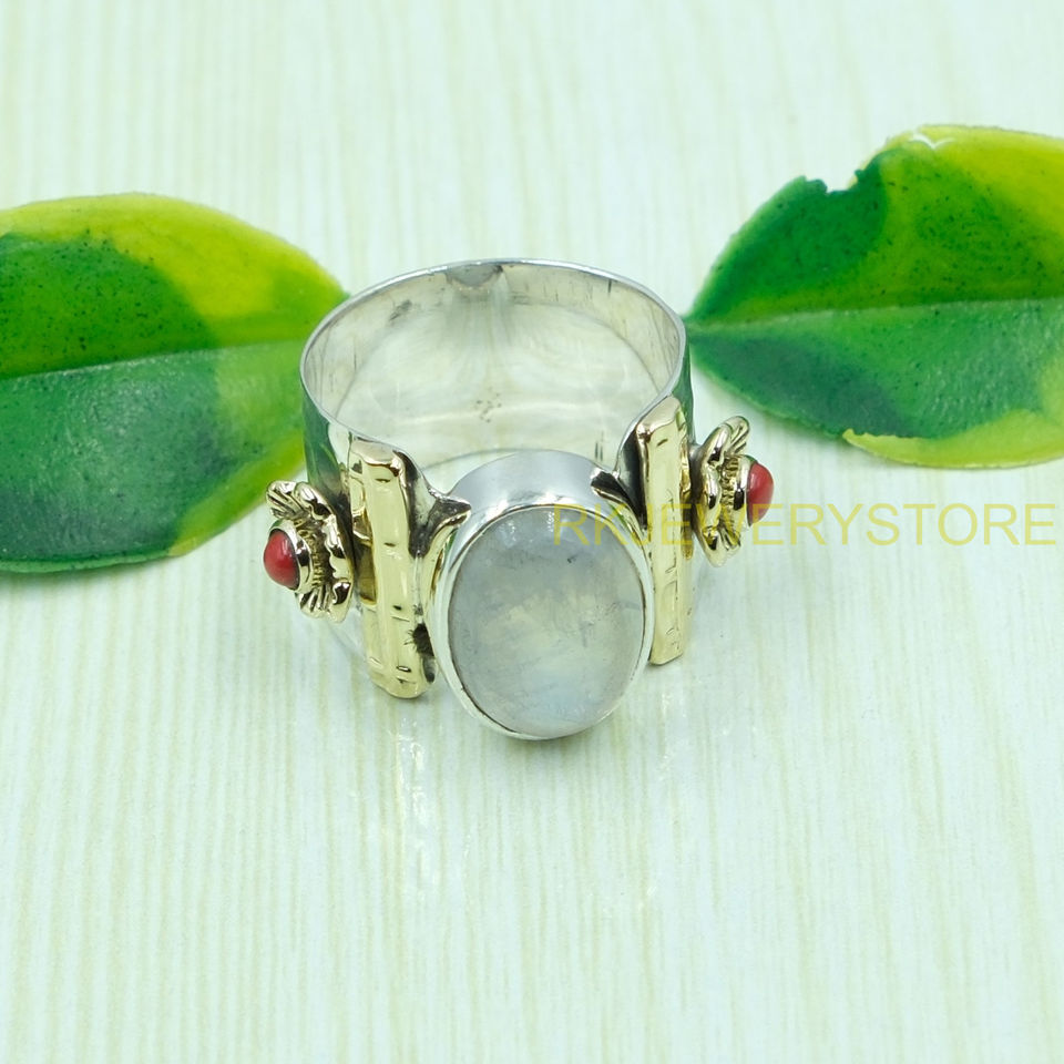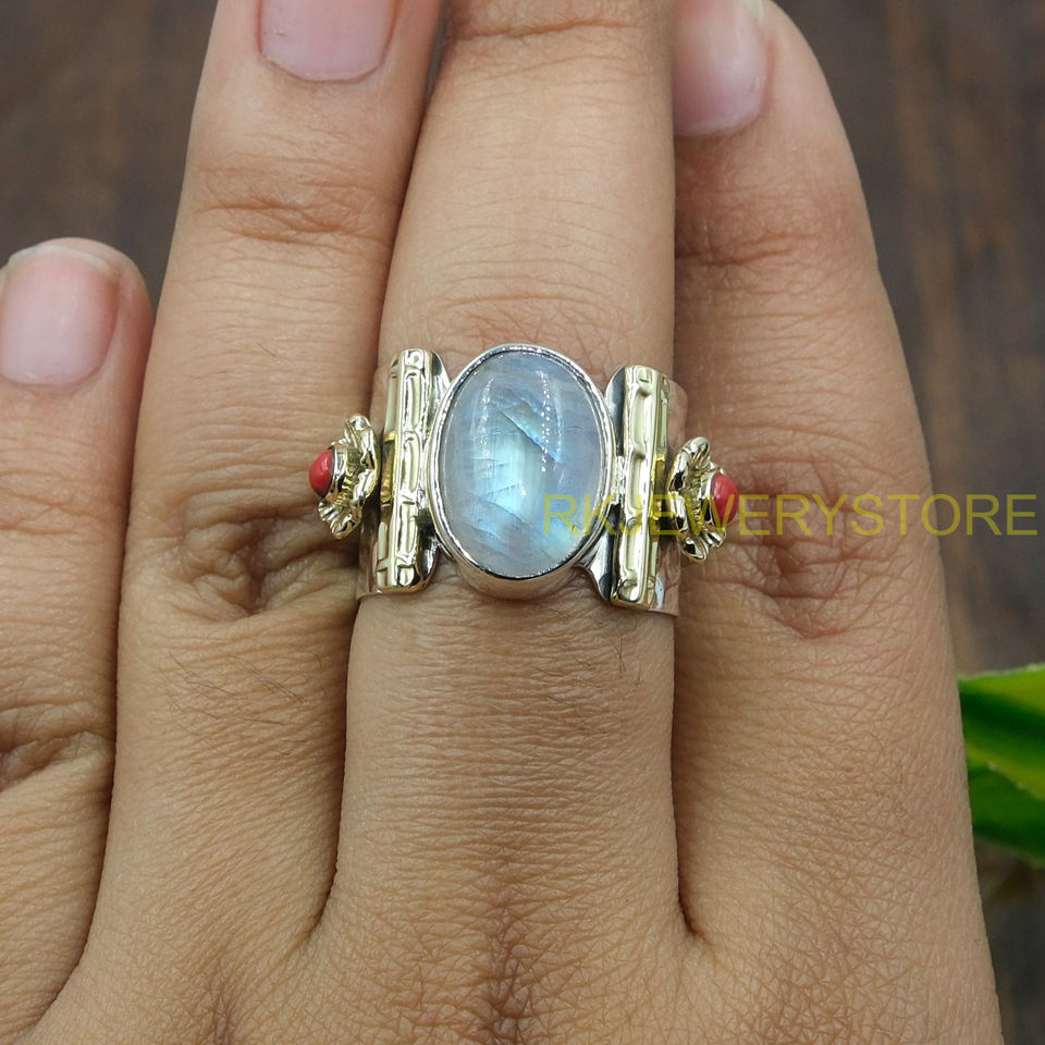 Blue Fire Rainbow Moonstone and Red Coral Pure 925 Sterling Silver With Brass Ring Handmade Hammered Ring for Moonstone Jewelry