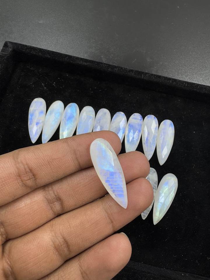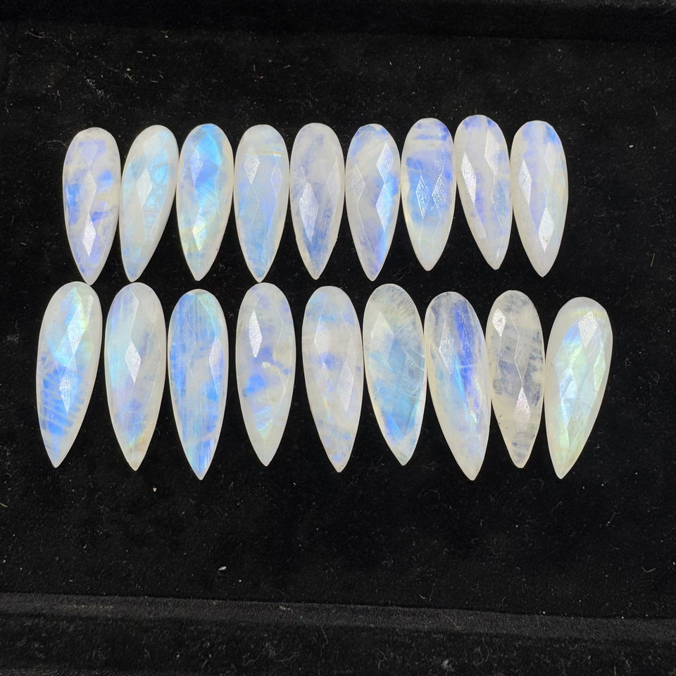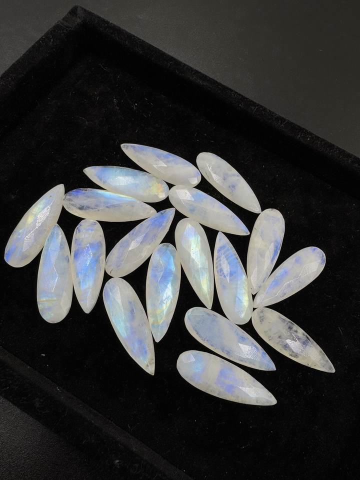 มูนสโตนสายรุ้งสีฟ้าฉูดฉาดอัญมณี briolette ทรงหลวมธรรมชาติขนาด11x33มม. ขายส่งมาก