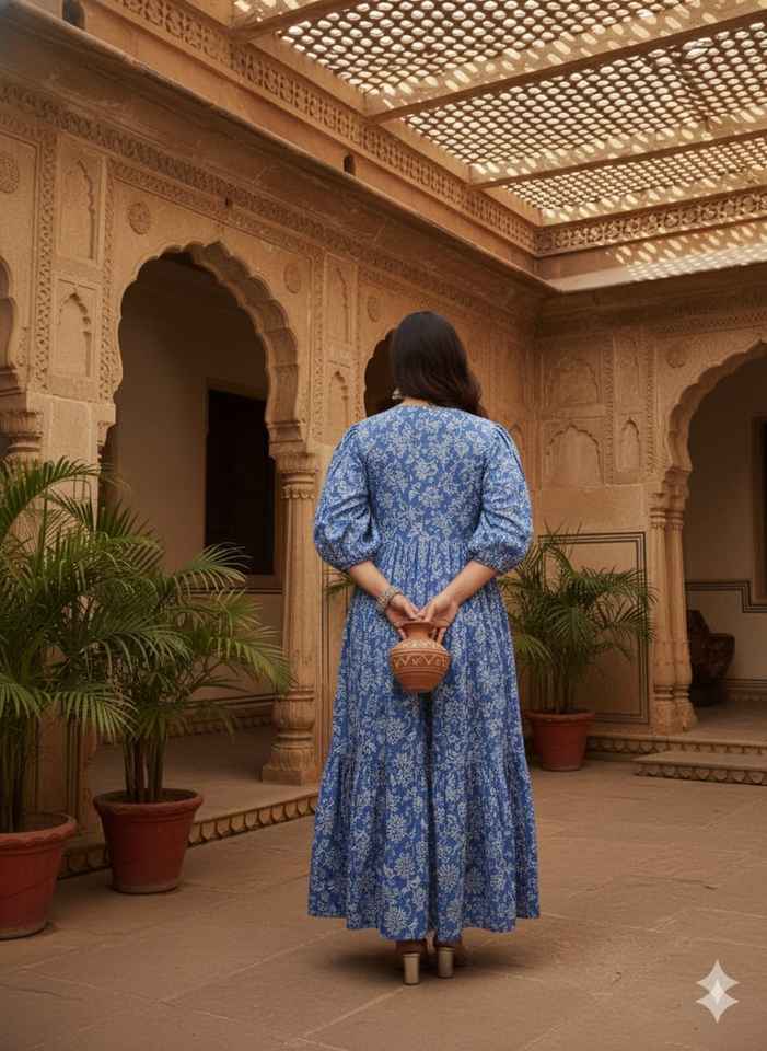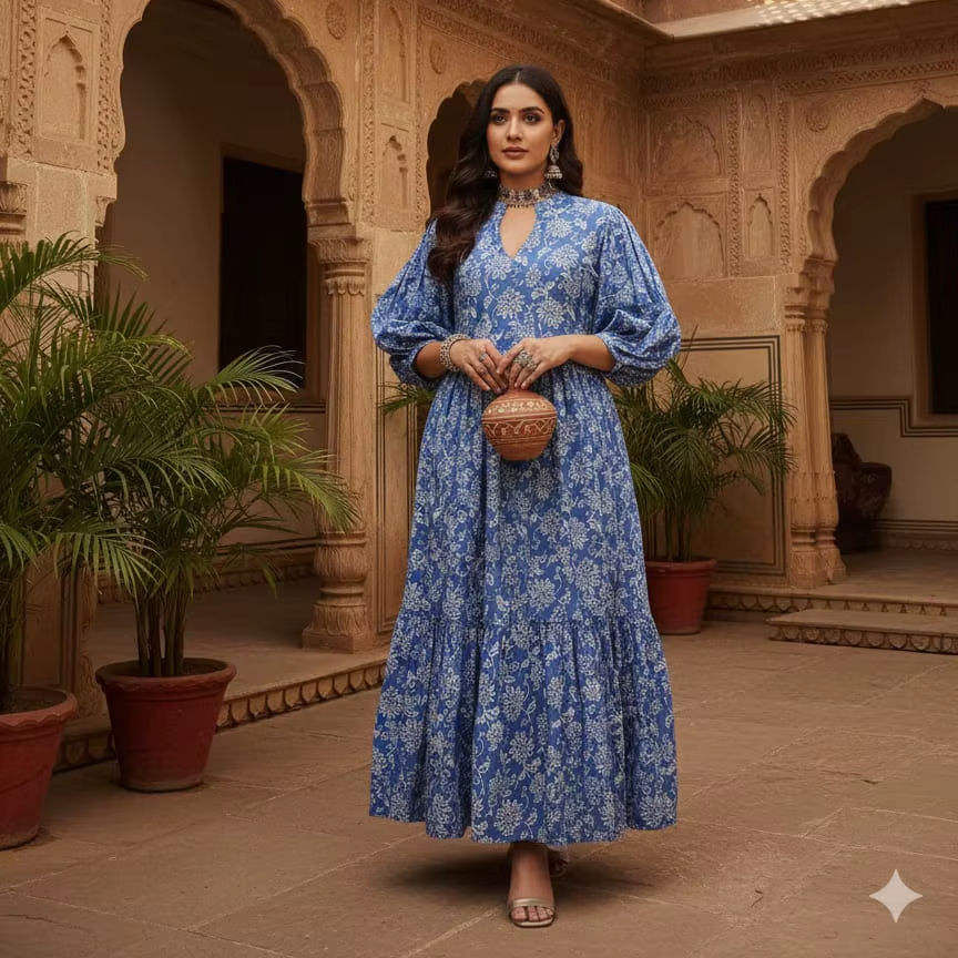 เดรสผ้าฝ้ายพิมพ์ลายดอกไม้สีฟ้า คอวี ทรงระบาย ยาวปานกลาง สไตล์โบฮีเมียนสำหรับผู้หญิง ฤดูร้อน ลายชนเผ่าอินเดีย ซักได้ เอวธรรมชาติ
