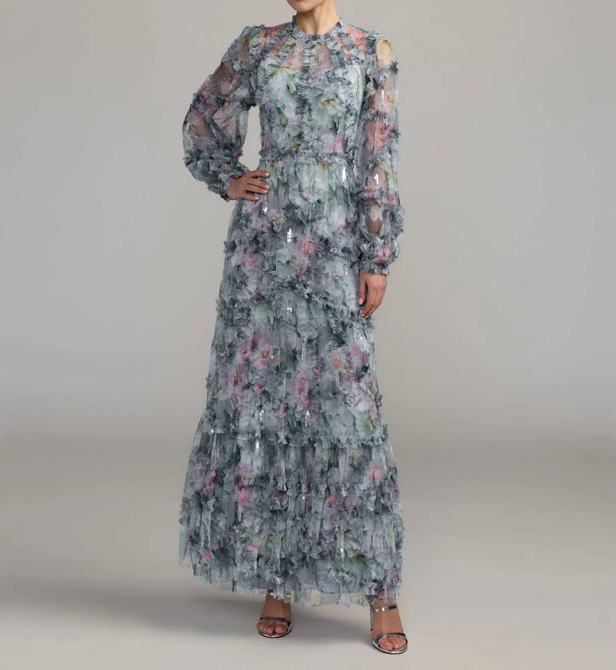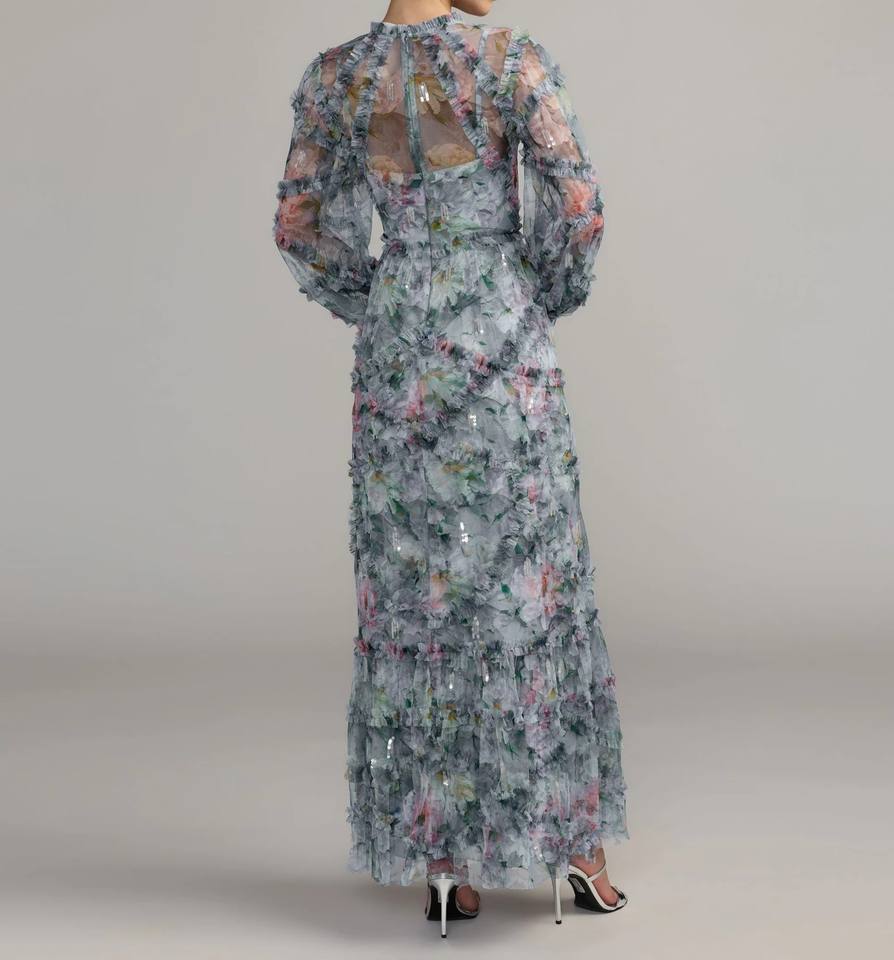 เดรสยาวสีฟ้าลายดอกไม้ คอทรงโอ แขนทรงโคมระบาย ผ้าทอพิมพ์ลายดิจิทัล เป็นมิตรต่อสิ่งแวดล้อม ซักได้ ป้องกันไฟฟ้าสถิตย์ รับผลิตแบบ OEM