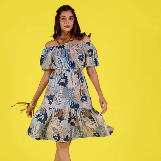 ชุดเดรสสีน้ำเงินลายดอกไม้ ทรงเข้ารูป กระโปรงบานระดับกลาง ไหล่เปลือย แขนสั้น คอเปิดไหล่ แต่งเชือกผูก ชายกระโปรงระบาย เอวธรรมชาติ เป็นมิตรต่อสิ่งแวดล้อม