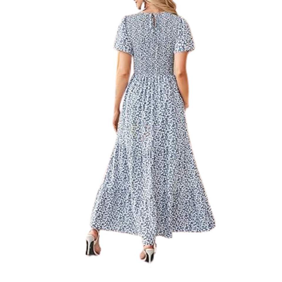 เดรสยาวพิมพ์ลายดอกไม้สีฟ้า แขนสั้น สไตล์โบฮีเมียน สำหรับฤดูร้อน ลายดอกเล็กๆ เสื้อผ้าผู้หญิง ขายส่ง