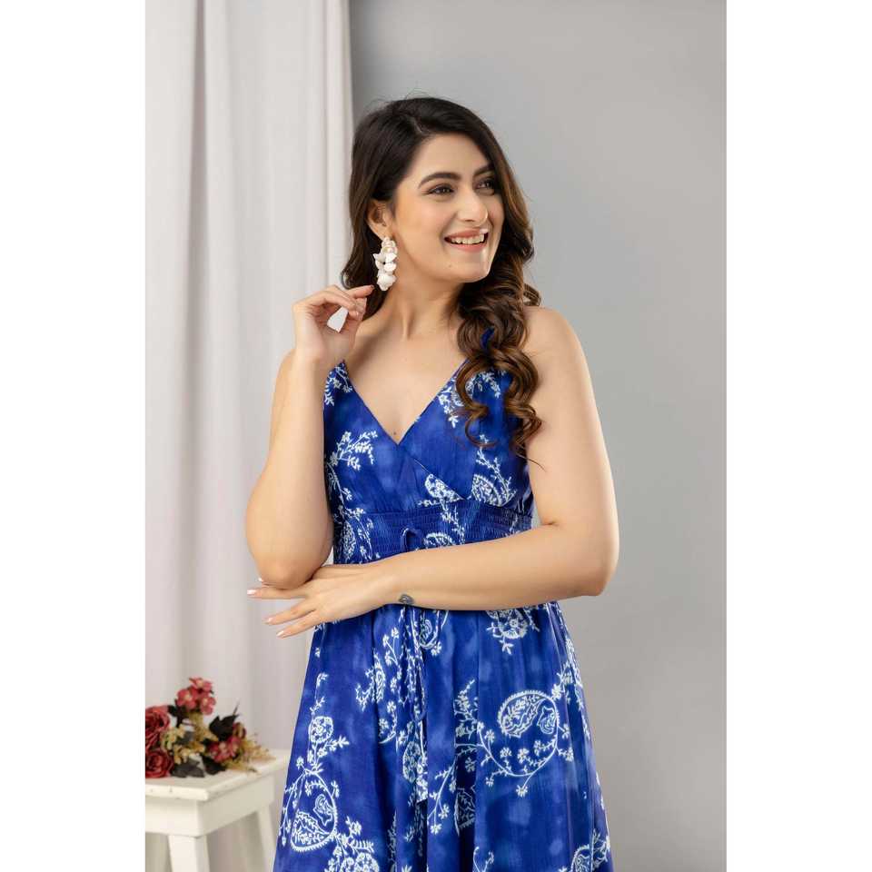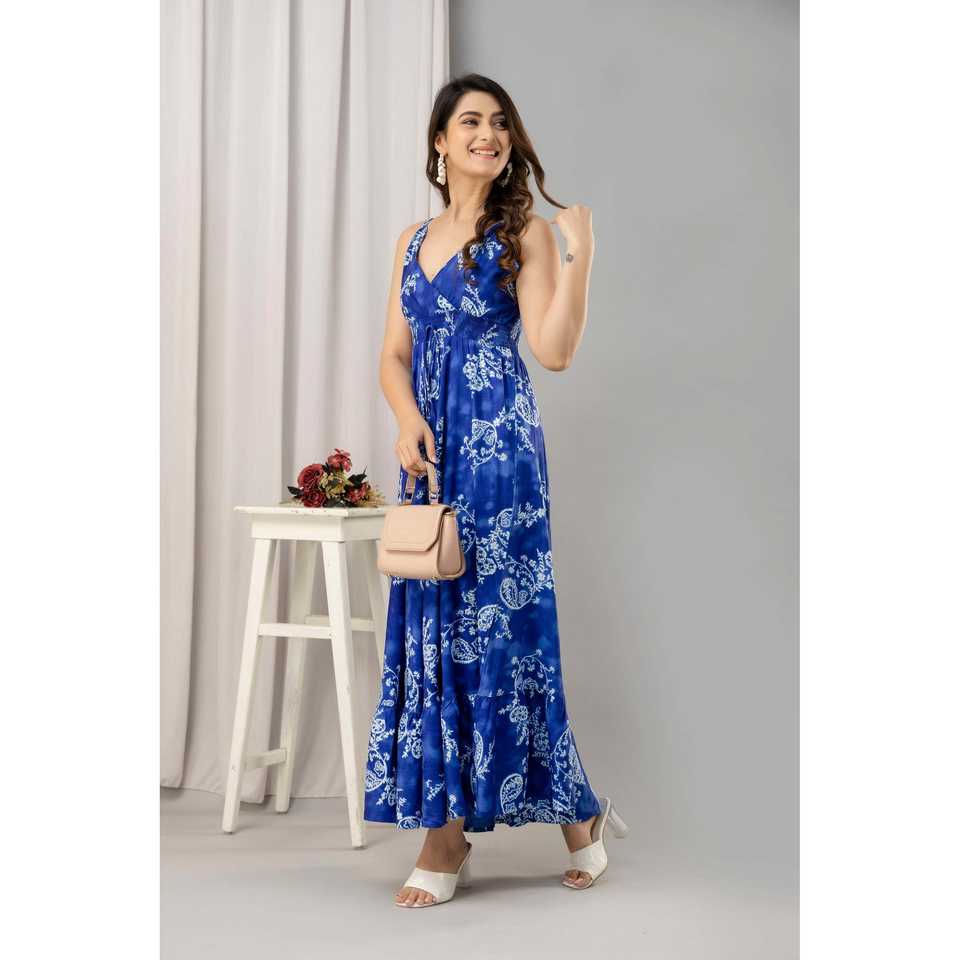 Dress-SHKUP1450แมกซี่ทรงเข้ารูปแขนกุดพิมพ์ลายดอกไม้สีฟ้าทำจากผ้าเรยอน