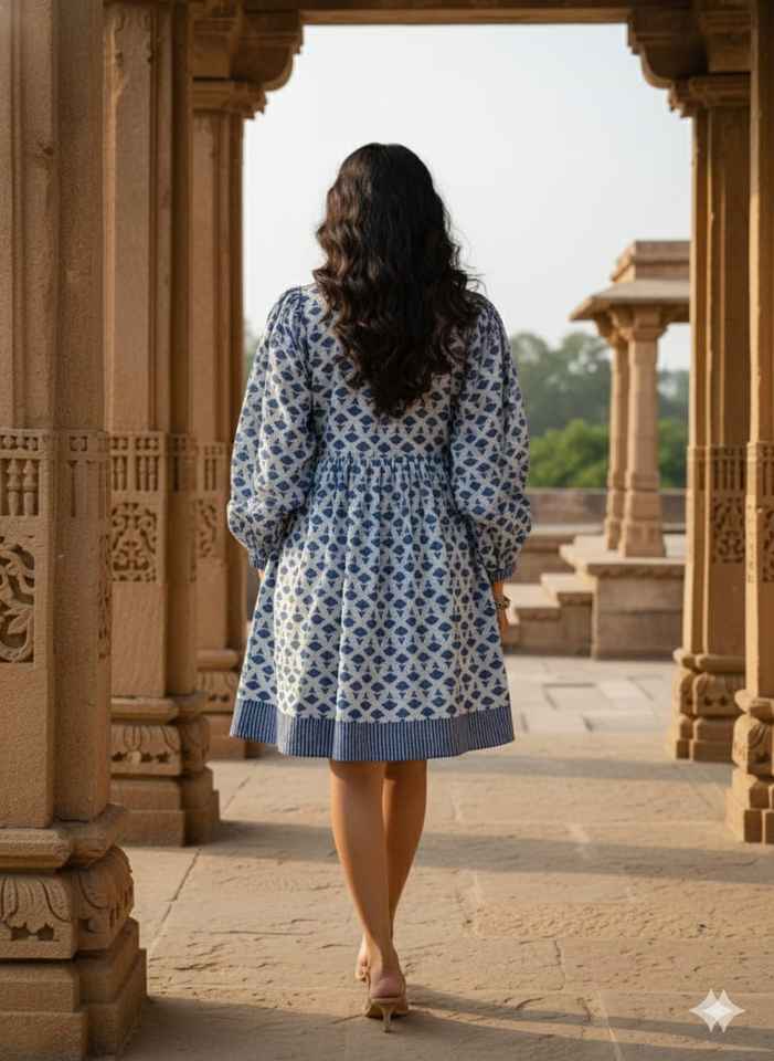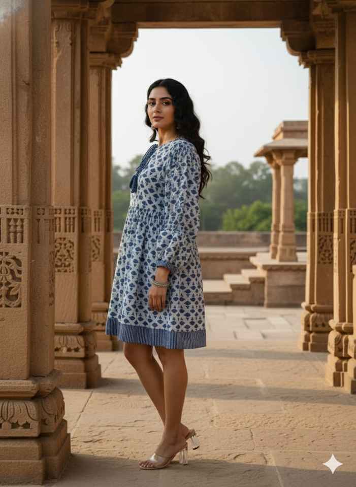 เดรสยาวปานกลางลายดอกไม้สีฟ้า ผ้าฝ้ายทรงทูนิคสำหรับฤดูร้อน สไตล์โบฮีเมียนสำหรับผู้หญิง ชุดอินเดียงานฝีมือสำหรับงานเทศกาล เอวเข้ารูปทรงธรรมชาติ