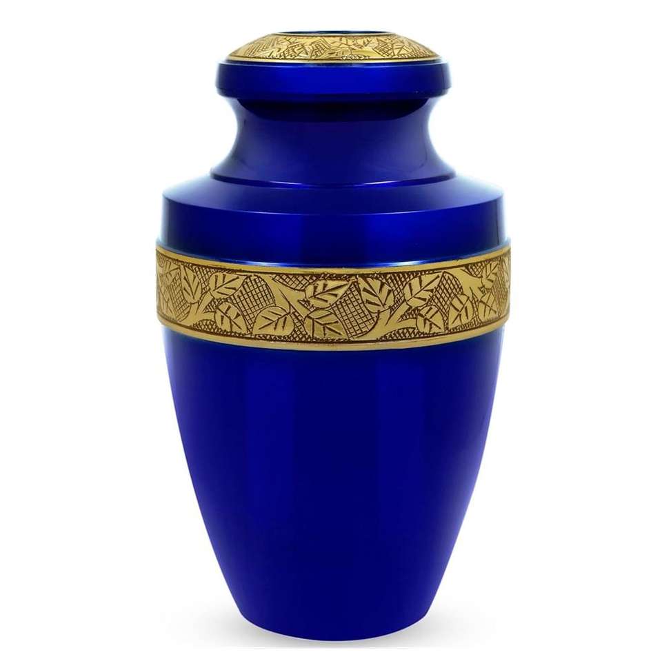 โกศทองเหลืองสำเร็จรูปสีฟ้ามันวาวขี้เถ้ากระดูกมนุษย์ขี้เถ้ากระดูกโกศโลหะออกแบบเฉพาะบุคคล