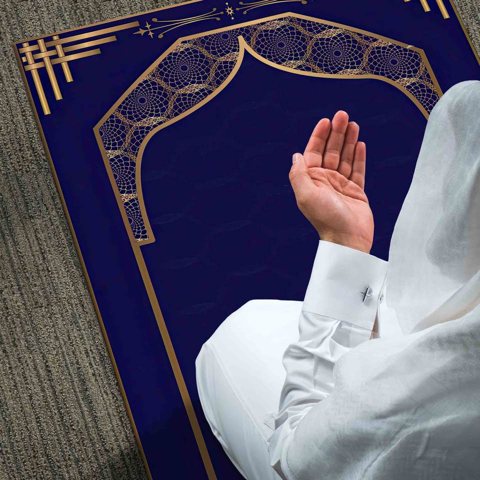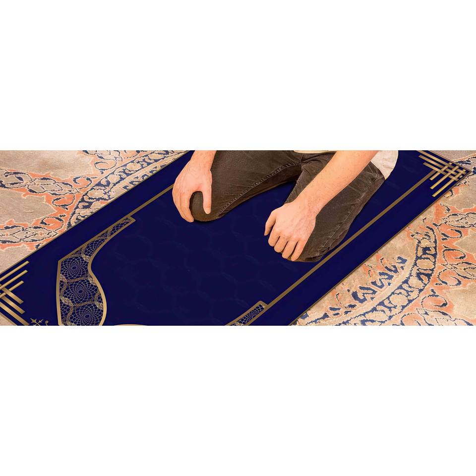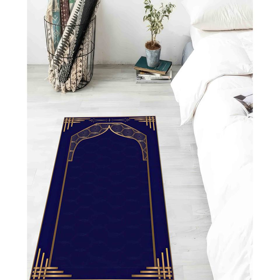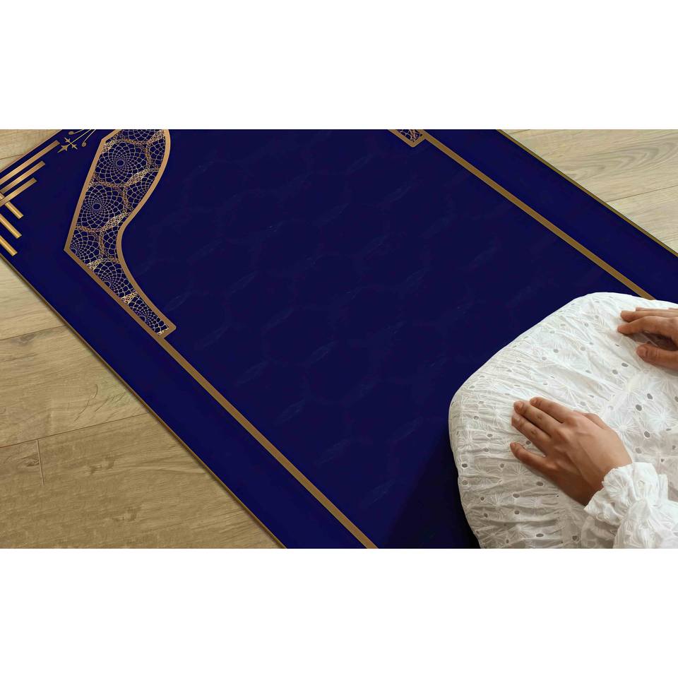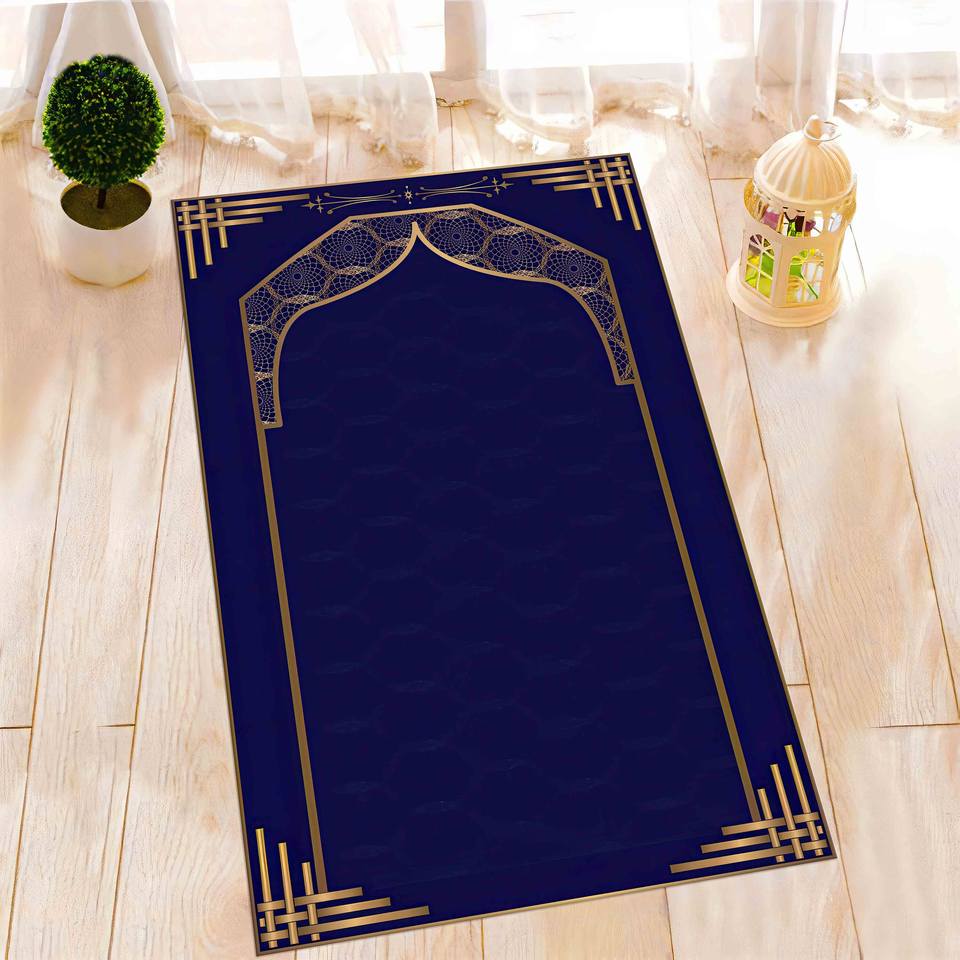 พรมละหมาดสีน้ำเงินและสีทอง: พรมสำหรับการละหมาดของชาวมุสลิมที่สวยงาม พรมบางแบบไม่ถักทอ