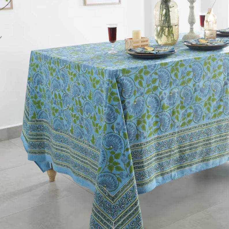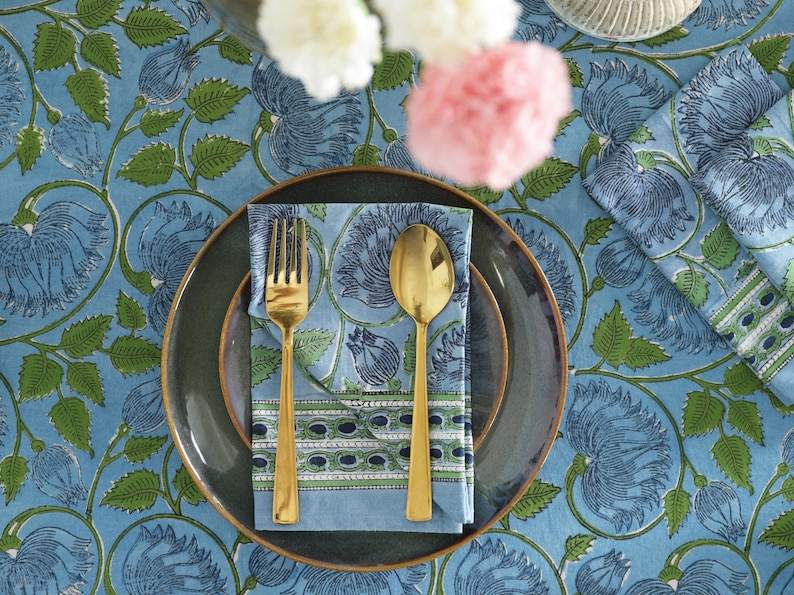 ผ้าปูโต๊ะพิมพ์ลายดอกไม้สีเขียวสีน้ำเงินสไตล์อินเดียผ้าปูโต๊ะทรงสี่เหลี่ยมแบบโบโฮของฝรั่งเศสผ้าคลุมโต๊ะของขวัญแต่งงานแบบกำหนดเองพร้อมผ้าเช็ดปาก