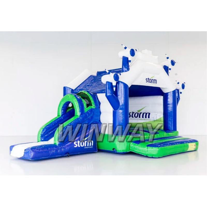บ้านเด้งพองลมสีเขียวน้ำเงินพร้อมสไลเดอร์ปราสาทเป่าลมที่แข็งแรงทนทานสำหรับเด็กเล่นกลางแจ้งในร่ม