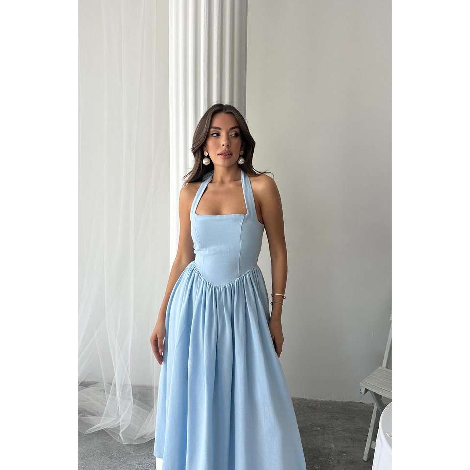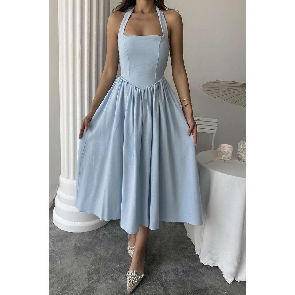 เดรสผ้าลินินสีน้ำเงินแบบผูกคอ ทรงเอ เอวธรรมชาติ ระบายอากาศได้ดี สวมใส่สบายๆ