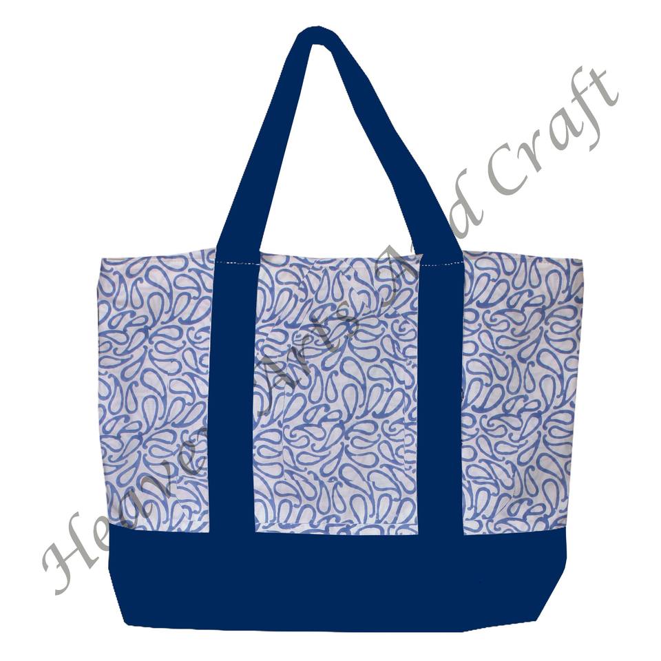กระเป๋าผ้าหิ้วพิมพ์ลายดอกไม้หลากสีสันจากอินเดีย ด้ามจับสีน้ำเงิน พร้อมสายสะพายสองเส้น ขายส่ง BHCB043