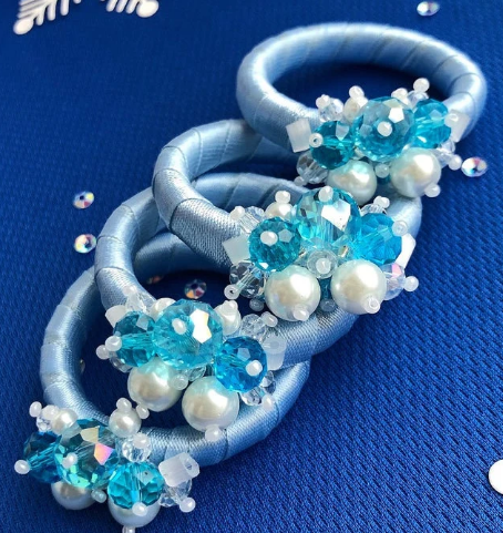 แหวนผ้าเช็ดปากสีฟ้าสำหรับวันหยุดที่มีไข่มุกแก้วและลูกปัดสำหรับตกแต่งตารางเทศกาลชุด4ชิ้น