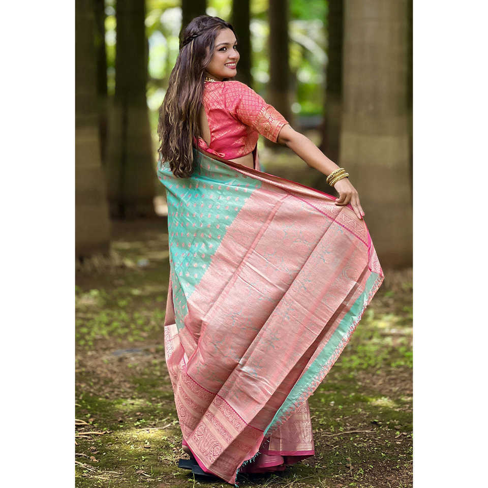 ผ้าไหมสีน้ำเงินแบบคันจิวราห์ พร้อมลายทอแบบดั้งเดิมด้วยด้ายซารี งานทอมือคุณภาพพรีเมียม ชุดประจำชาติอินเดีย