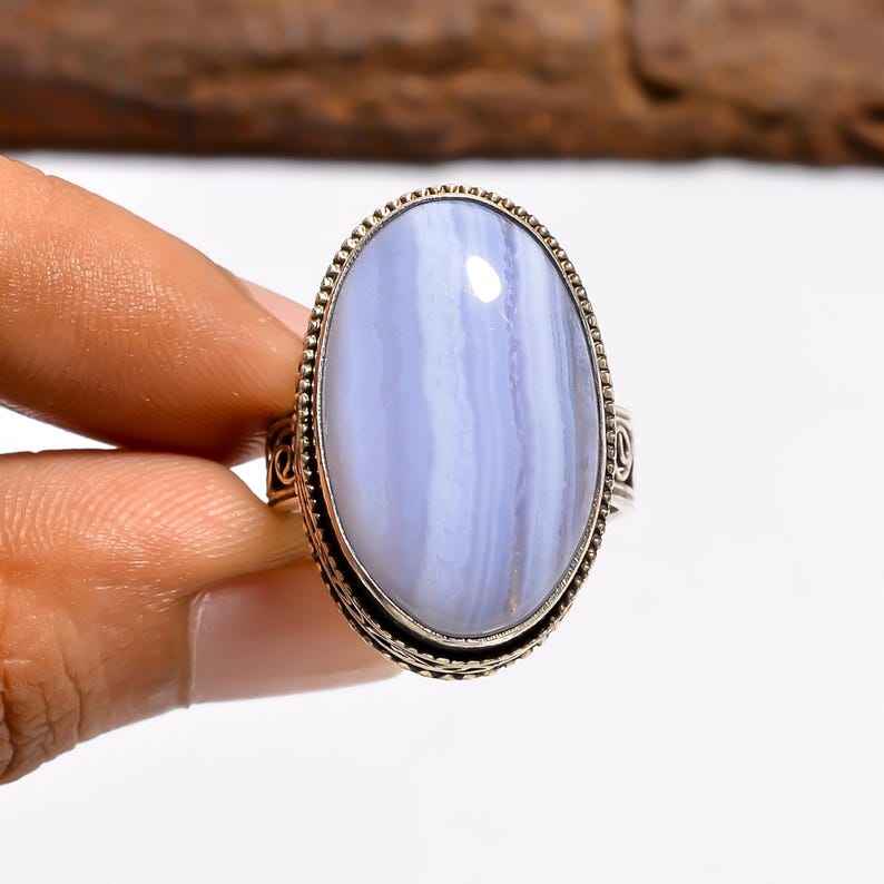 แหวนพลอยบลูเลซอาเกตทรงรี สไตล์วินเทจ เงินแท้ 925 งานแฮนด์เมด ของขวัญสำหรับเธอ