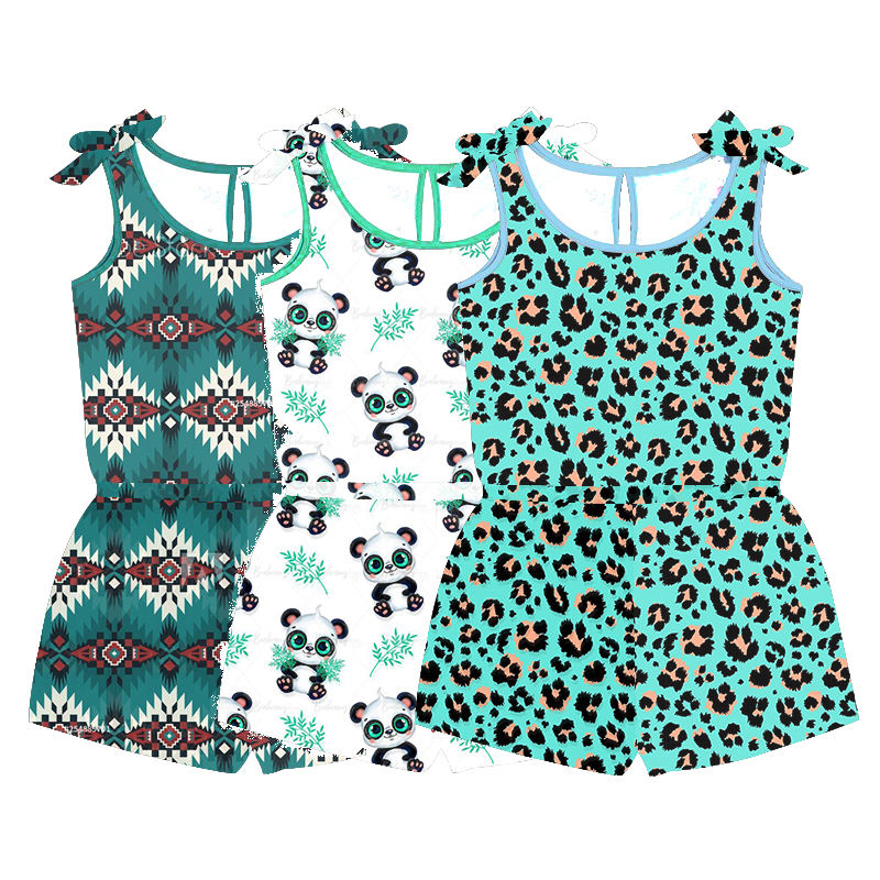ชุดรอมเปอร์เด็ก ลายเสือดาวสีน้ำเงิน สายผูกไหล่แบบเปิดไหล่ ชุดรอมเปอร์เด็กแรกเกิด ชุดรอมเปอร์เด็กผู้หญิงสำหรับฤดูร้อน