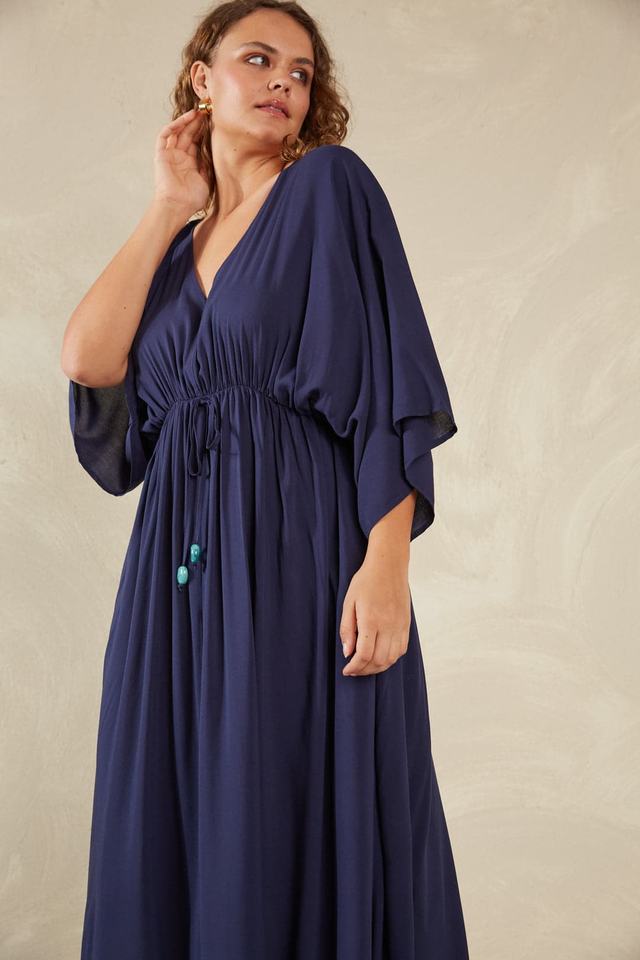 เดรสยาวสไตล์โบฮีเมียนสีน้ำเงิน แขนยาว ผ้าเรยอน 100% แต่งพู่ คอวี สำหรับผู้หญิง สไตล์ลำลอง
