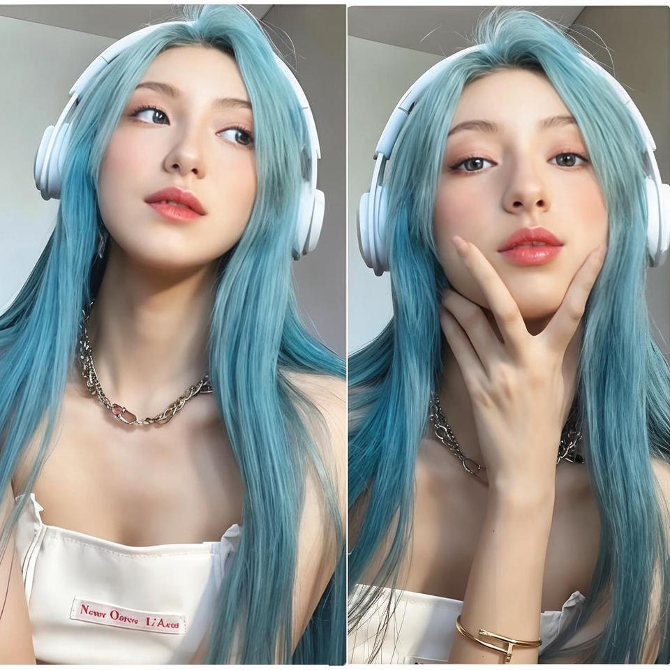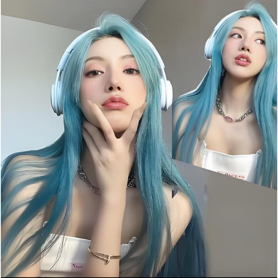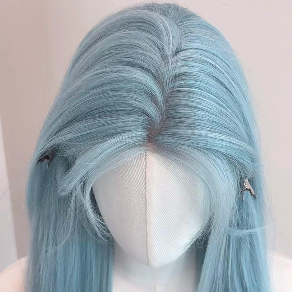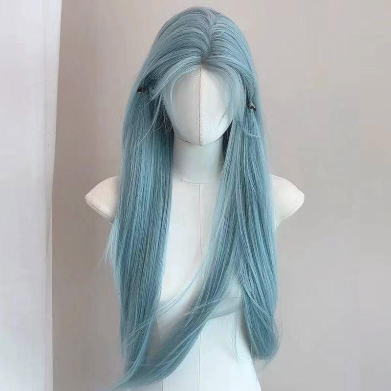 วิกผมยาวตรงสีฟ้าพร้อมผมหน้าม้าปัดข้าง ไรผมธรรมชาติ ลูกไม้โปร่งใส ใยคาเนคาลอน วิกผมเต็มศีรษะสำหรับผู้หญิง