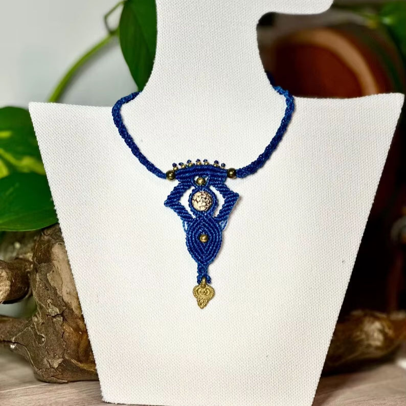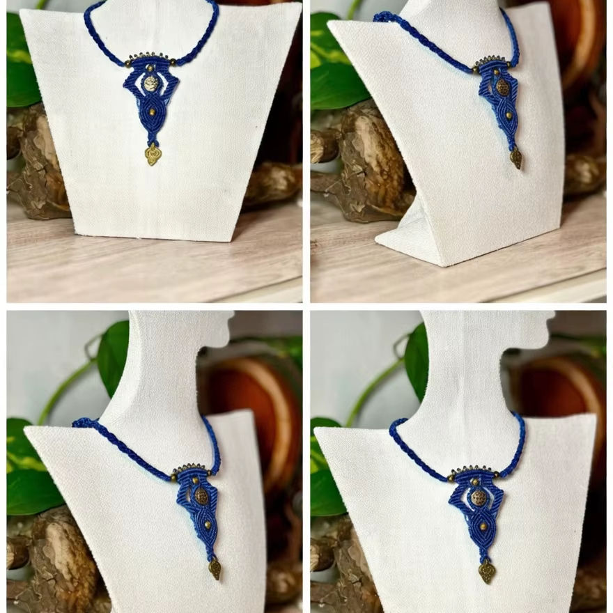 สร้อยคอมาคราเม่รูปดอกบัวสีน้ำเงิน ทำด้วยมือ สไตล์มินิมอล จี้สัญลักษณ์ สร้อยคอสำหรับงานปาร์ตี้ เครื่องประดับศิลปะ สร้อยคอ HARI OM