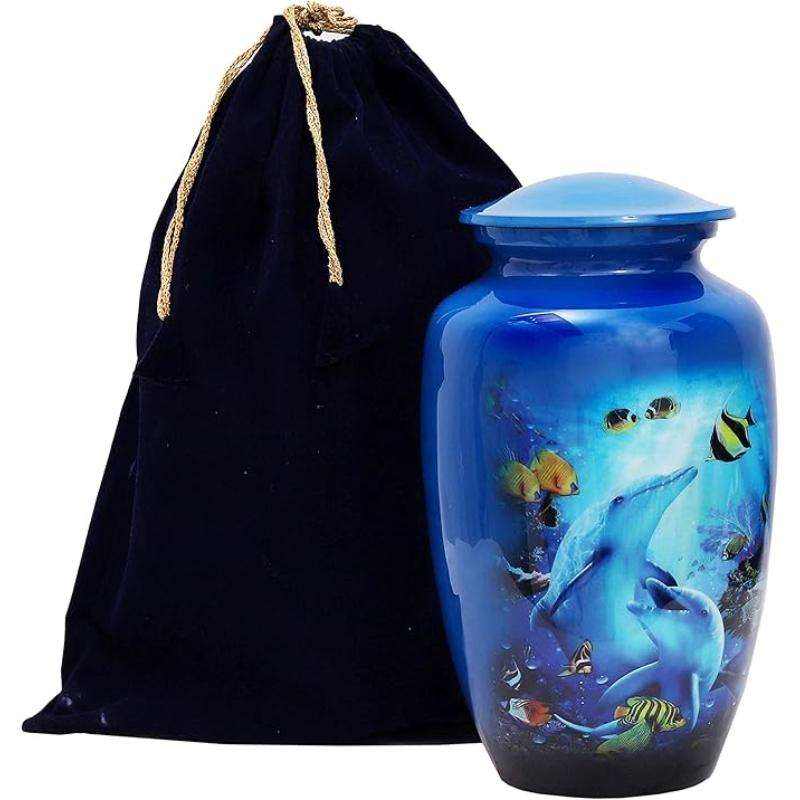 โกศบรรจุอัฐิสีน้ำเงินลายหินอ่อนพร้อมลายเส้นสีทองและถุงกำมะหยี่สำหรับบรรจุอัฐิผู้ใหญ่