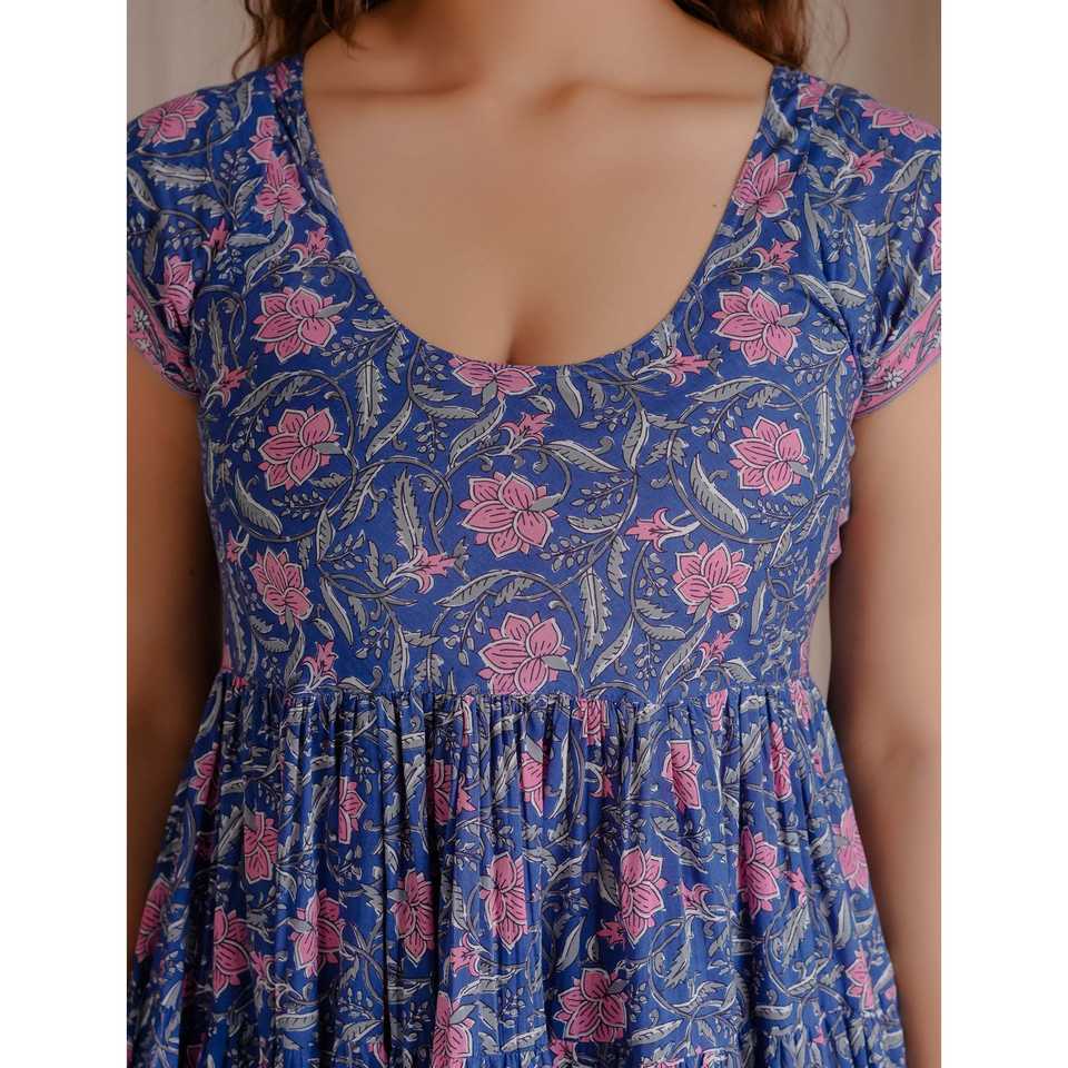 ชุดเดรสผ้าฝ้ายมัลมัลสีน้ำเงินพิมพ์ลายบล็อกด้วยมือ สไตล์ลำลองหรูหราแบบโกธิคสำหรับสุภาพสตรีออฟฟิศ ไซส์ XS-5XL ระบายอากาศได้ดี แฟชั่นสำหรับออกงานกลางคืน ODM