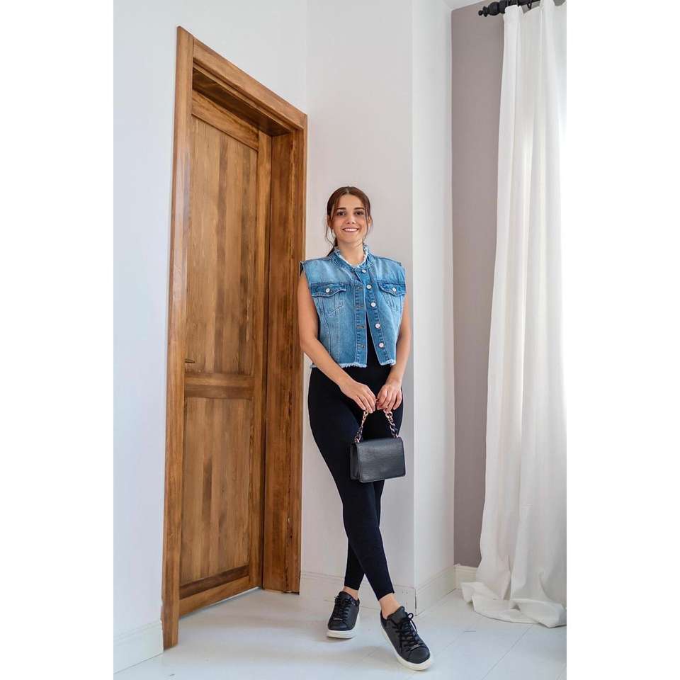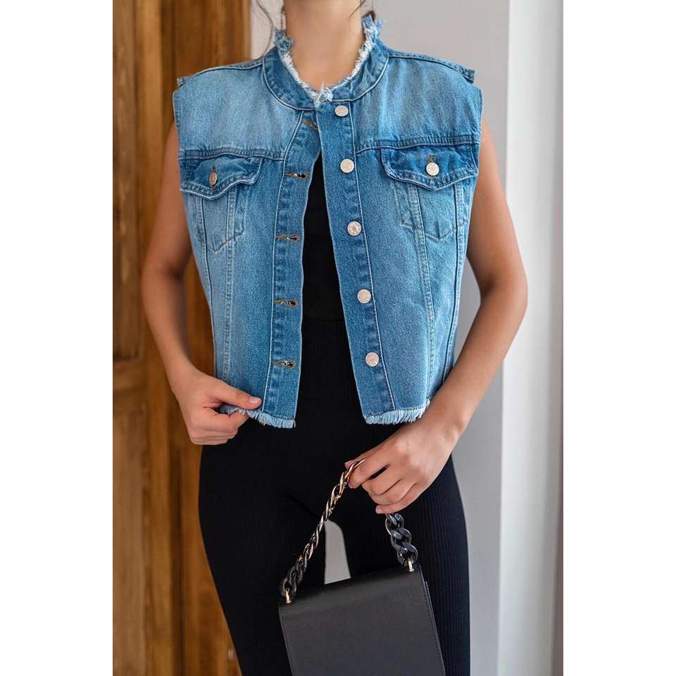 เสื้อกั๊กยีนส์ผู้หญิงบลูโอเชียนผ้าฝ้าย 100% แขนกุด สีฟ้าอ่อน ไซส์กลาง