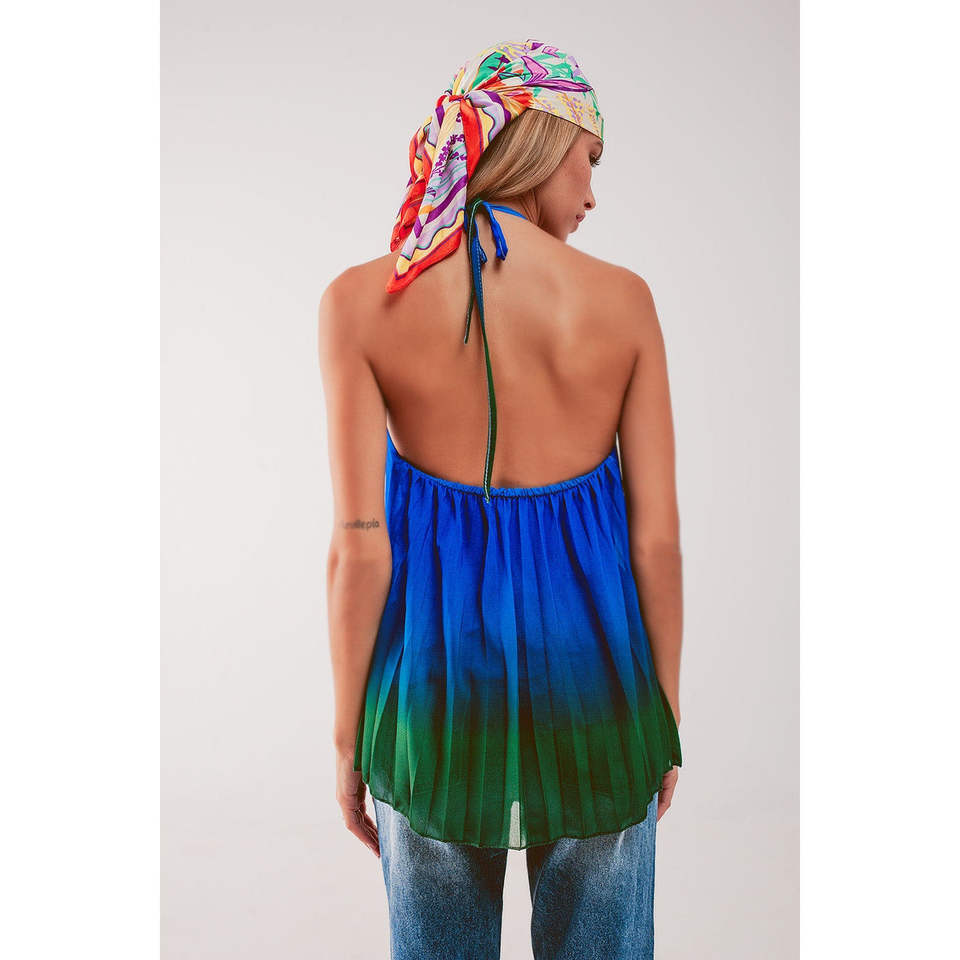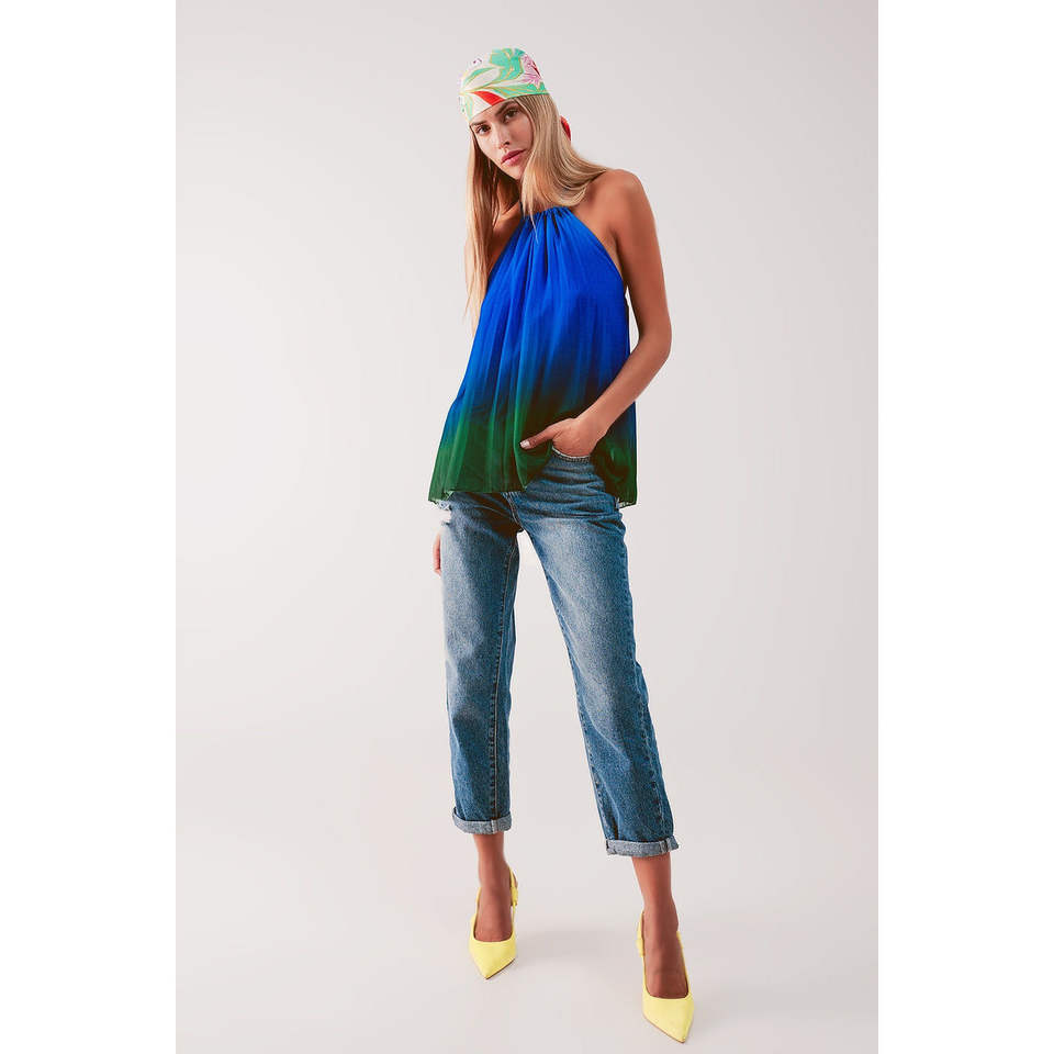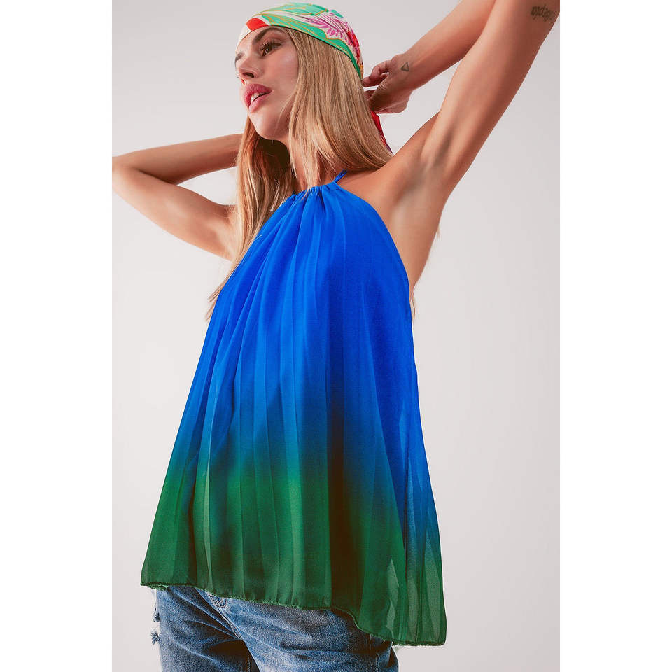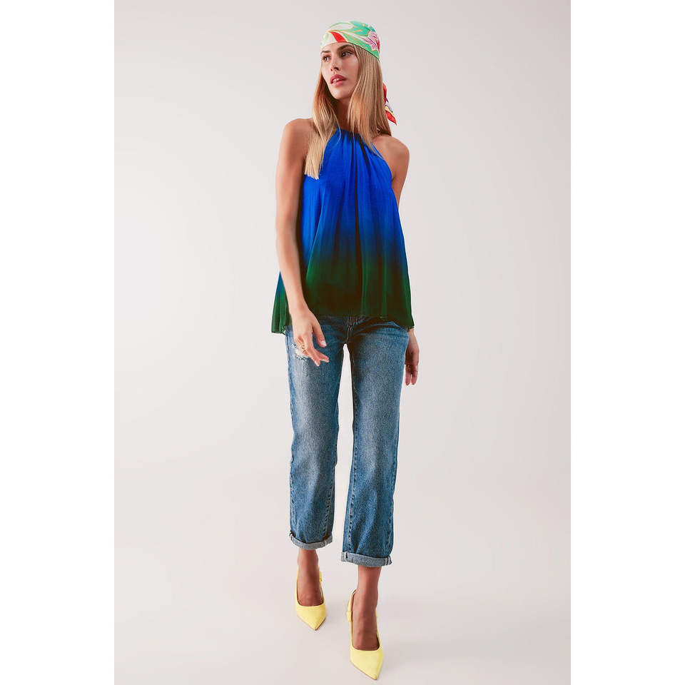 เสื้อท่อนบนสีน้ำเงินไล่เฉดแบบคอสูงจับจีบ ผ้าชีฟองโปร่งแสง ลายดอกไม้หรูหราและลายเรียบ สำหรับงานเลี้ยงอย่างเป็นทางการ ขนาด ODM ไซส์ XS ถึง 6XL