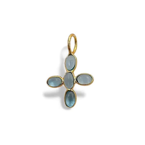 จี้รูปกากบาทประดับโอปอลสีน้ำเงินทรงรีขนาด 5x3 มม. โอปอลสีน้ำเงินเรียบเนียน ชุบทอง ประดับขอบแบบ Bezel งานแฮนด์เมด จากซัพพลายเออร์เครื่องประดับในอินเดีย