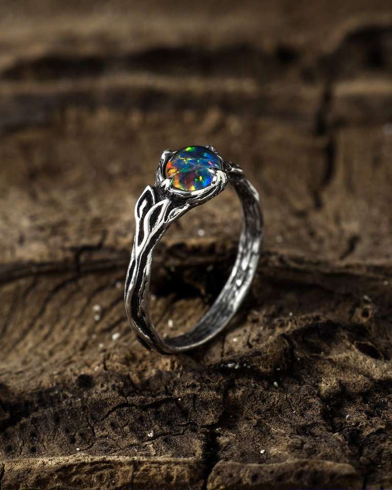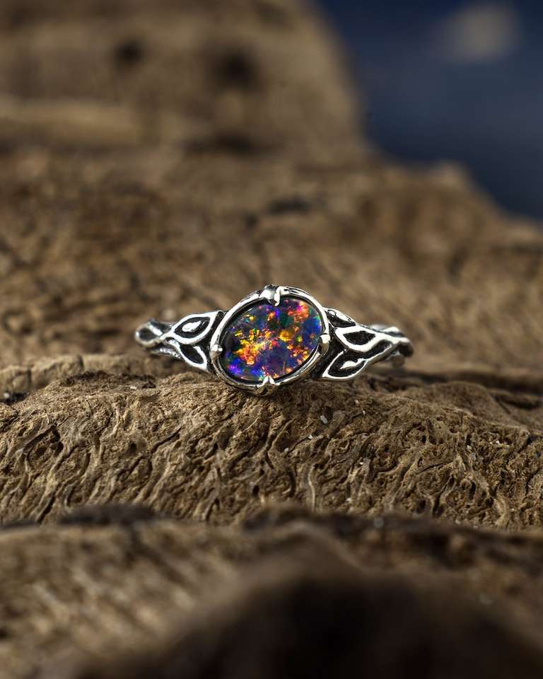 แหวนโอปอลสีน้ำเงิน เงินแท้ 925 รับรองโดย IGI เครื่องประดับคุณภาพสูง แหวนสัญญา ดีไซน์ใบไม้กิ่งไม้ โอปอลออสเตรเลีย