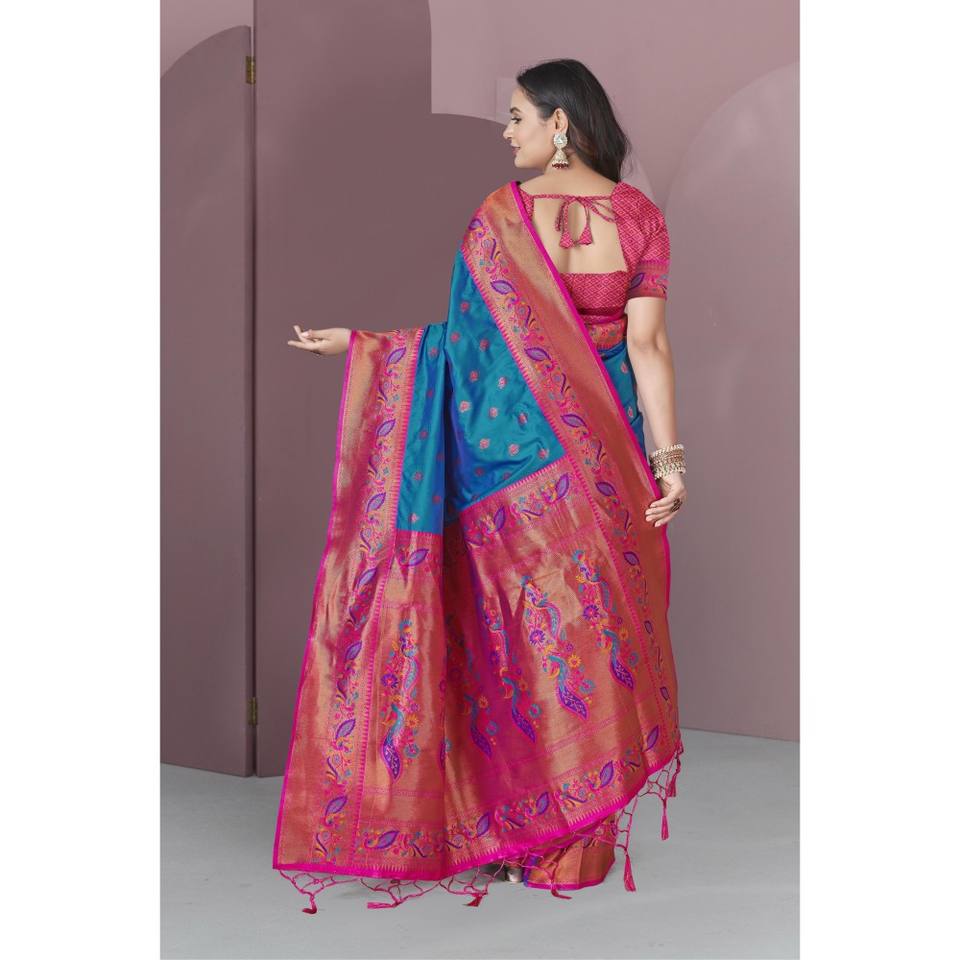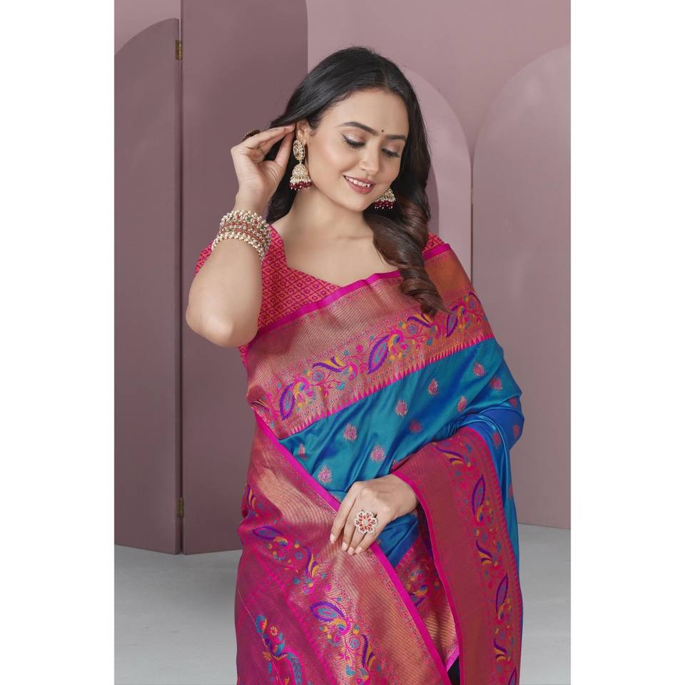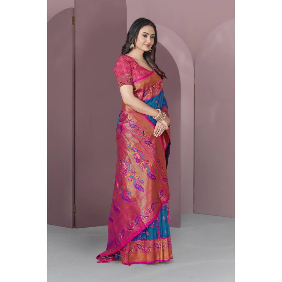 ผ้าไหมพิมพ์ลายมีนาคารี ปาธานี สีน้ำเงิน แบรนด์อีลิท วีฟส์ พร้อมผ้าคลุมไหล่ลายดั้งเดิมสำหรับผู้หญิง