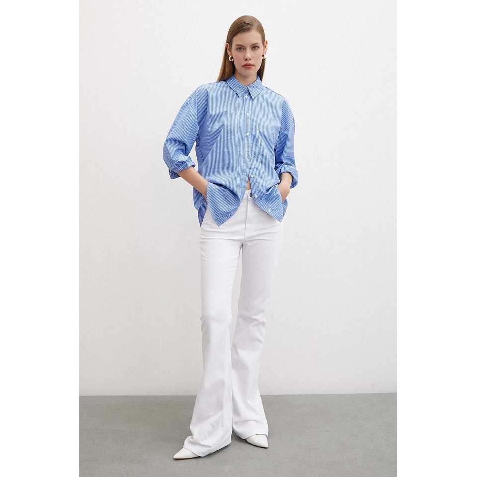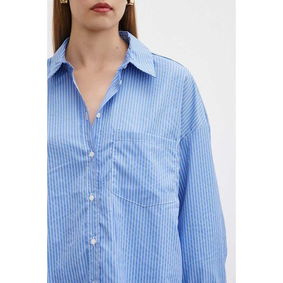 เสื้อเชิ้ตติดกระดุมลายทางสีน้ำเงิน เสื้อเชิ้ตผ้าป๊อปลินลำลองสำหรับผู้หญิง สไตล์เรียบง่ายสำหรับทุกวัน