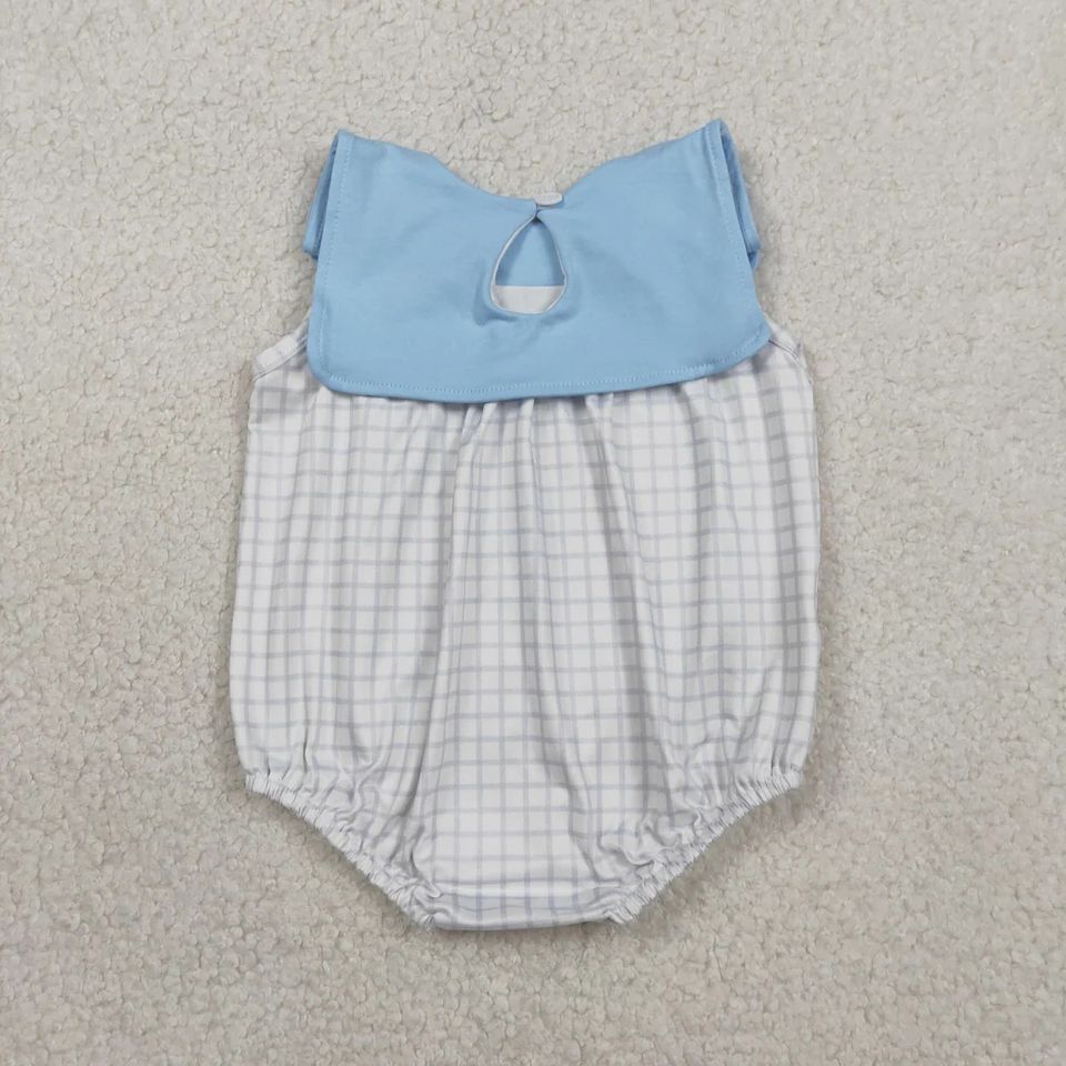 ชุดรอมเปอร์เด็กผู้ชายผ้าไหมนม/ผ้าฝ้ายลายสก็อตสีน้ำเงินแบบไม่มีแขน เป็นมิตรกับสิ่งแวดล้อม