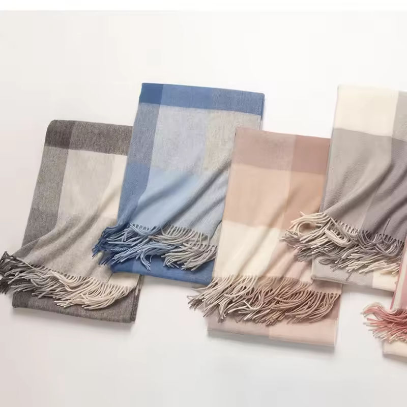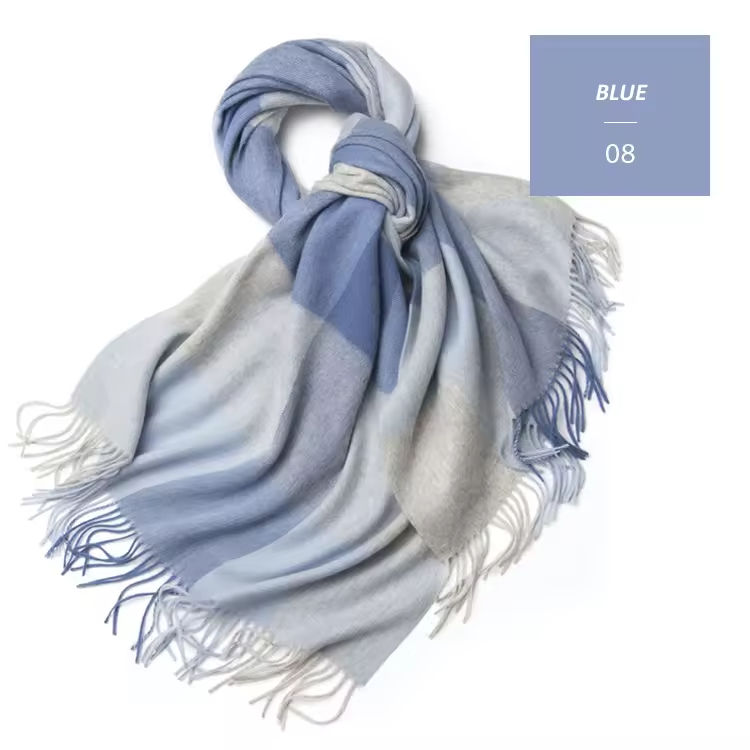 ผ้าพันคอผสมขนสัตว์ลายสก๊อตสีน้ำเงิน ผ้าคลุมไหล่ลายตารางนุ่ม อุ่น ระบายอากาศได้ดี ผ้าพันคอหลากสีพร้อมขอบพู่