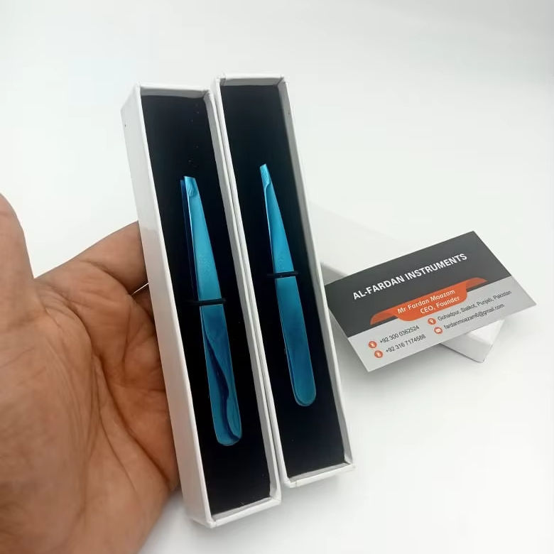 แหนบคิ้วสีพลาสม่าสีฟ้าแหนบคิ้วสเตนเลสแบบยั่งยืนโลโก้ที่กำหนดเอง