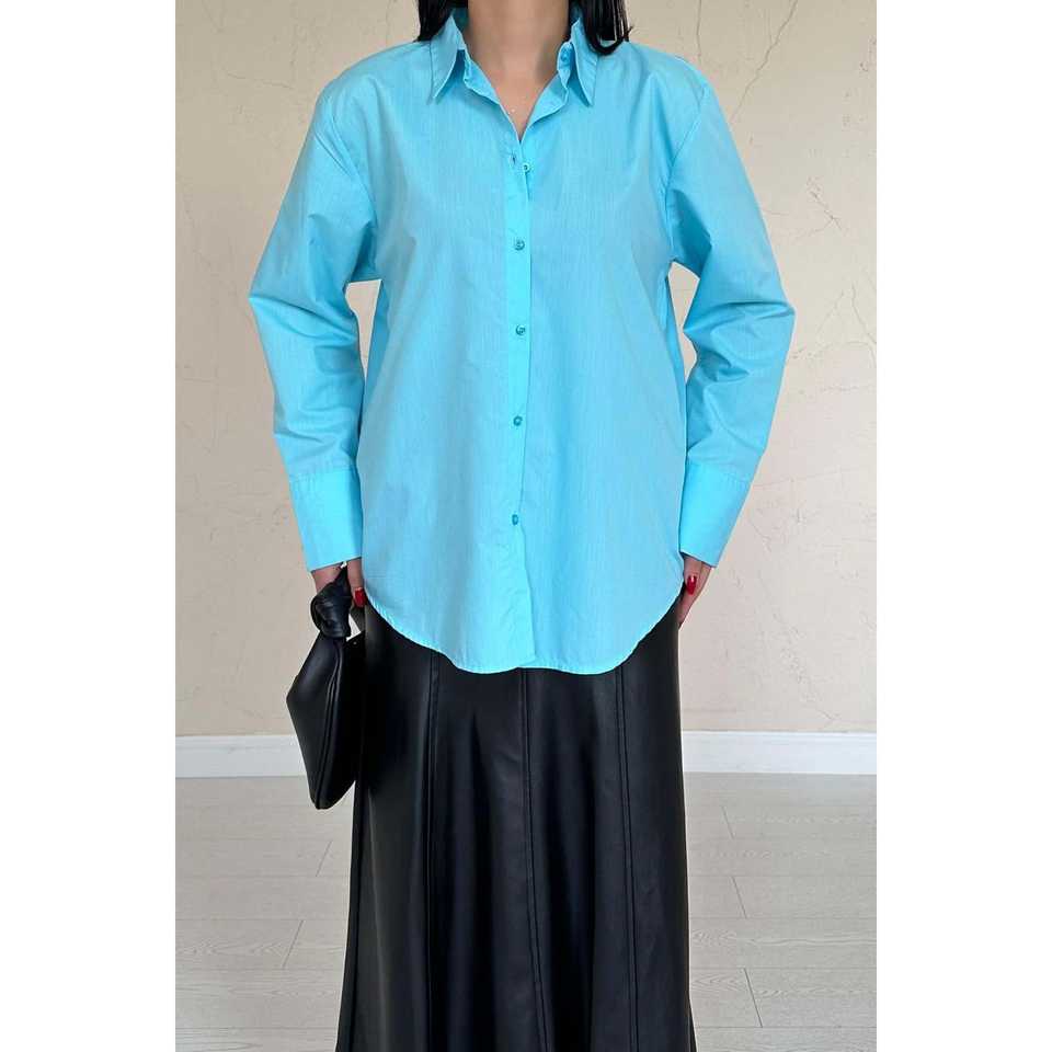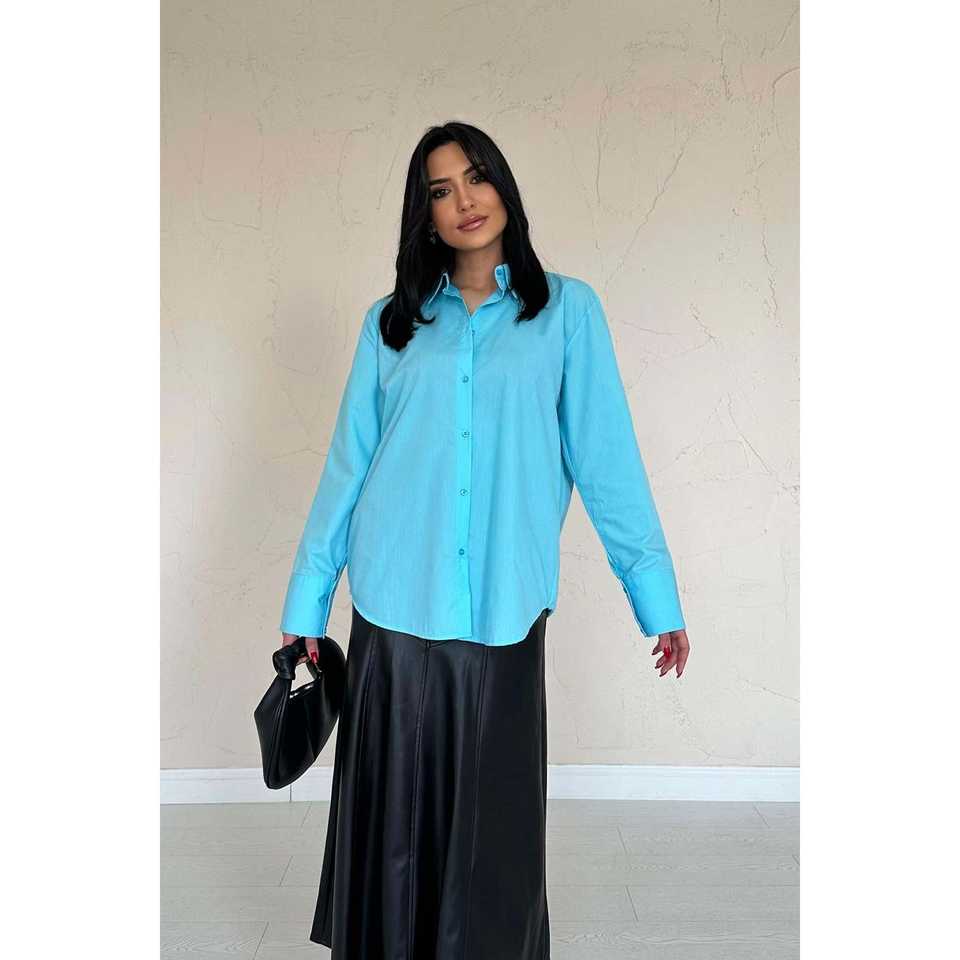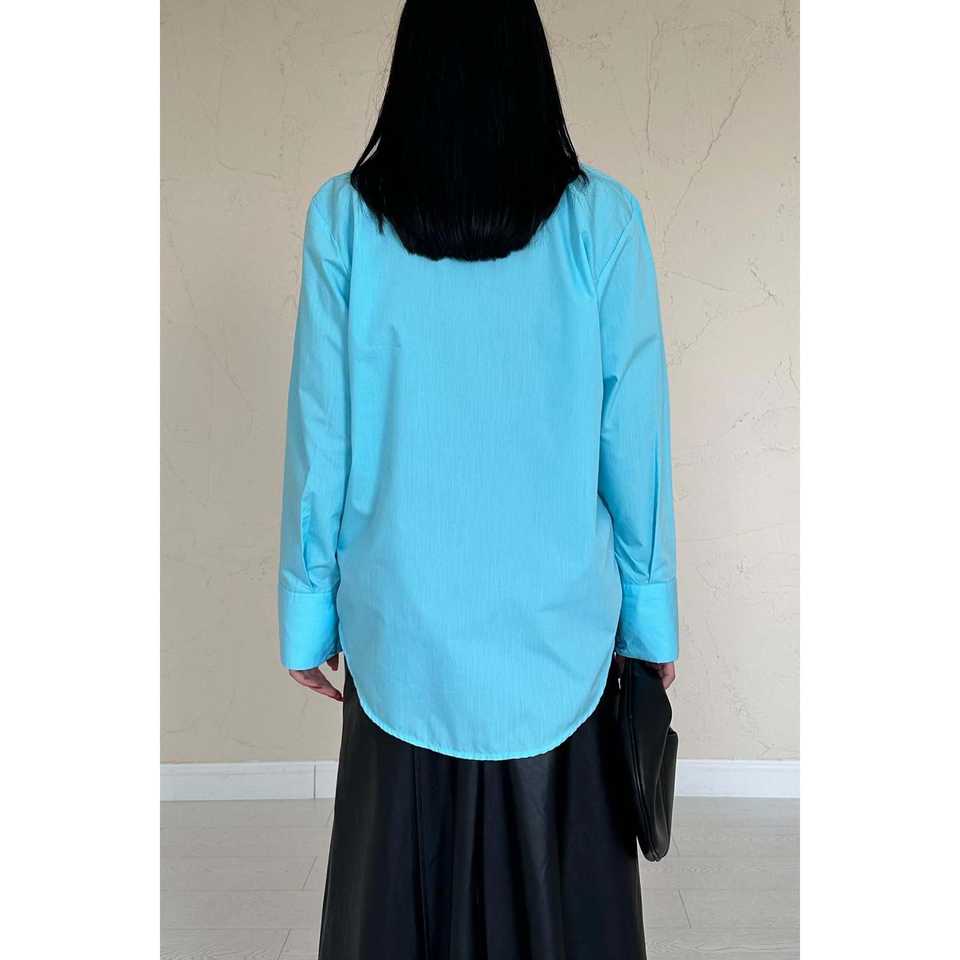 เสื้อเชิ้ตผู้หญิงสีน้ำเงิน ผ้าป๊อปลิน สไตล์ลำลอง ติดกระดุม แขนยาว เรียบง่าย ใส่ได้ทุกวัน