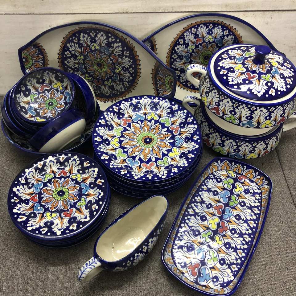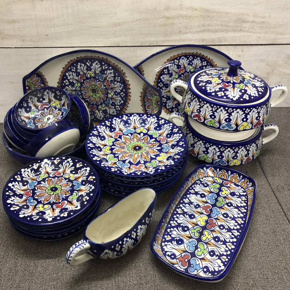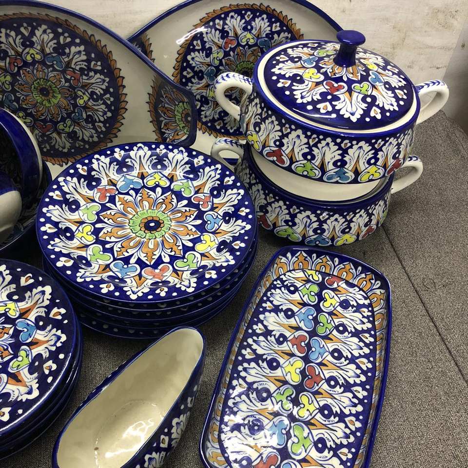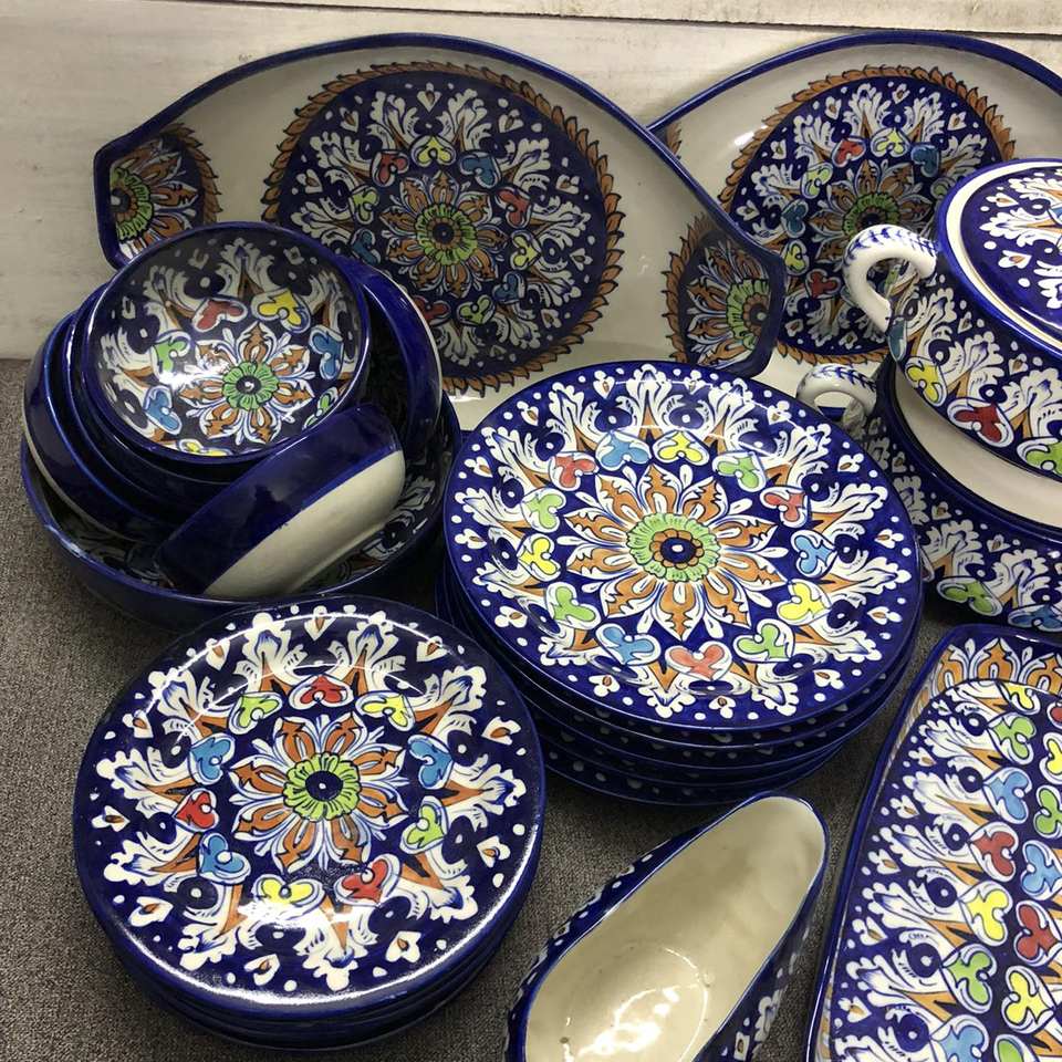 ชุดรับประทานอาหารค่ำเซรามิกสีฟ้าที่เงียบสงบชุดรับประทานอาหารเคลือบด้วยมือแบบพรีเมี่ยมชุดรับประทานอาหารเซรามิกทาสีด้วยมือของปากีสถาน