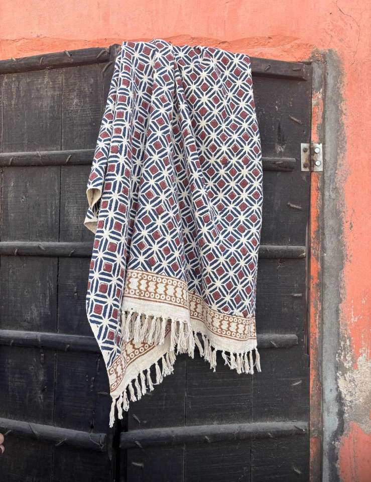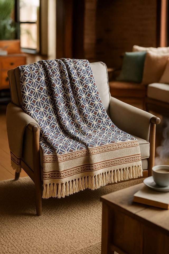 ผ้าห่มโซฟาพิมพ์ลายเรขาคณิตสีน้ำเงินและสีแดงทำด้วยมือ100% ผ้าฝ้ายถักแบบโบฮีเมียนออกแบบได้ตามต้องการสำหรับโซฟาผลิตในอินเดีย
