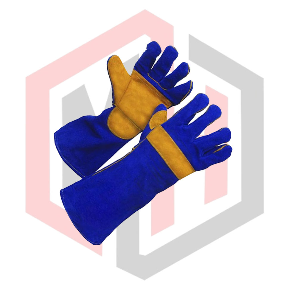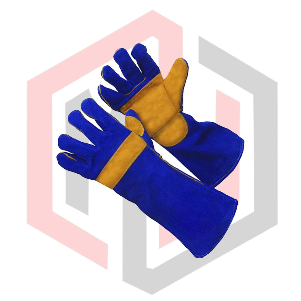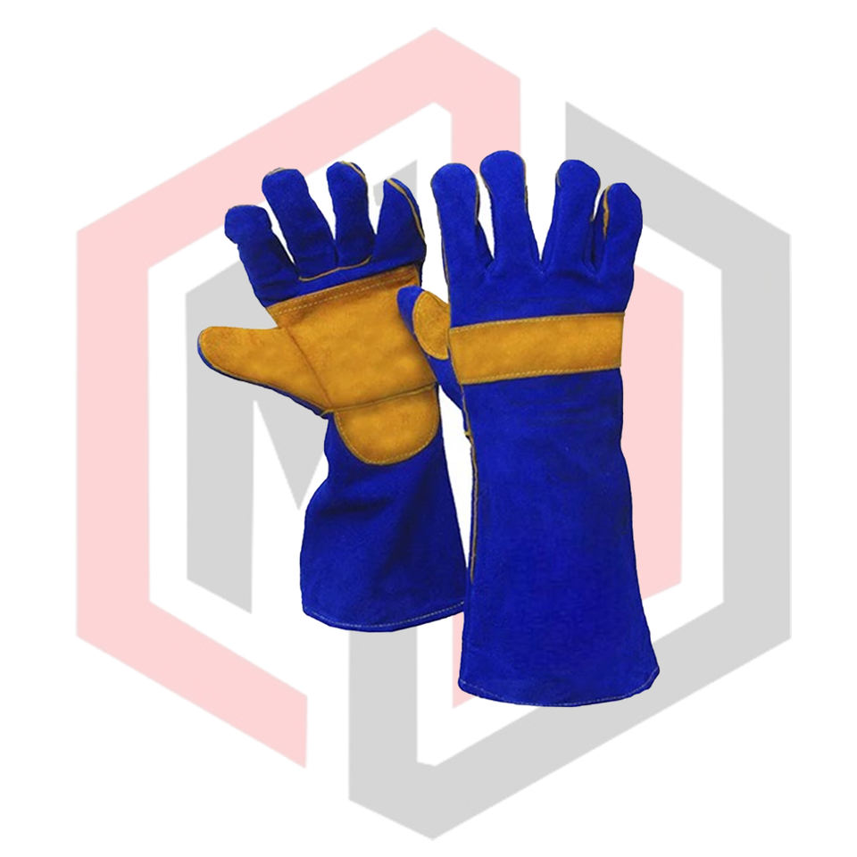 ถุงมือเชื่อมหนังเสริมแรงสีน้ำเงิน ถุงมือป้องกันเต็มรูปแบบ ยืดหยุ่น ระบายอากาศได้ดี ทนต่อการฉีกขาด ทนต่อการสึกหรอ ทนความร้อน