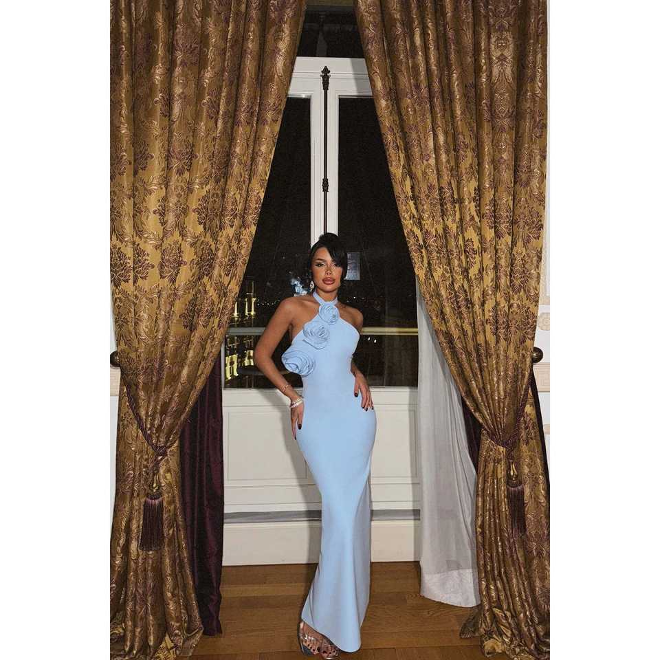ชุดเดรสทรงเอไลน์สีน้ำเงินประดับดอกกุหลาบ แต่งระบายช่วงเอวทรงเอ็มไพร์ สำหรับงานแต่งงาน งานเลี้ยงตอนเย็น ไซส์พลัส XL ผ้าโพลีเอสเตอร์ ยาวกรอมพื้น ประดับด้วยลายปัก