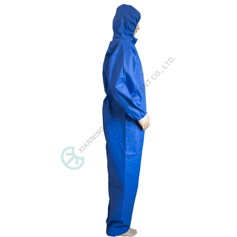 ชุดคลุมทำงานแบบใช้แล้วทิ้งสีน้ำเงิน SMS สำหรับงานพ่นสี ผลิตโดยผู้ผลิตชุดคลุมแบบขายส่ง ทำจากผ้าไม่ถักทอ ใช้สำหรับป้องกันในโรงงาน