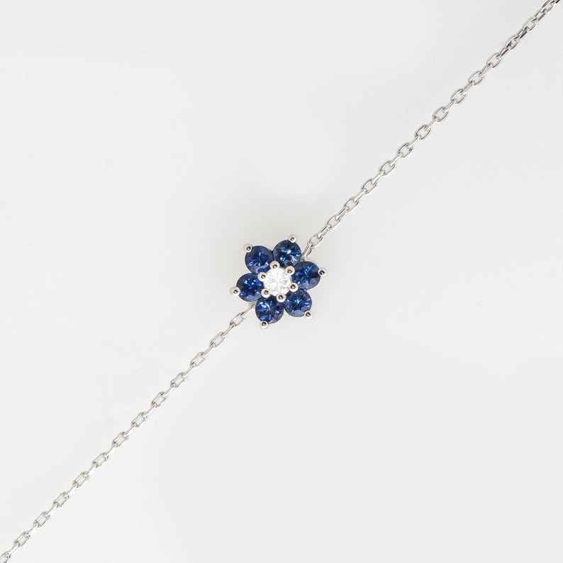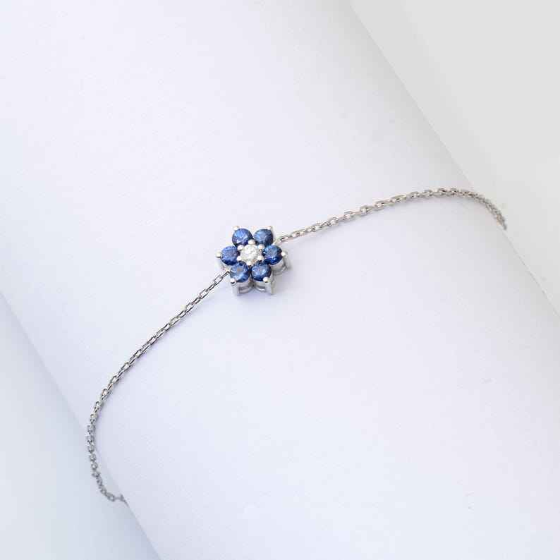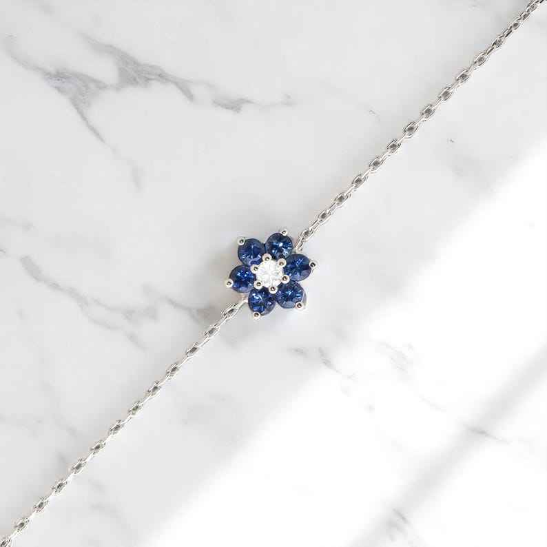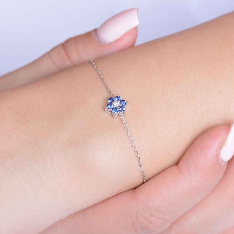 สร้อยข้อมือดอกไม้ประดับไพลินสีน้ำเงิน สร้อยโซ่เล็กประดับไพลินทรงกลม เครื่องประดับอัญมณีประจำวันเกิดที่หรูหรา