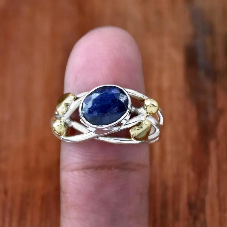 แหวนแซฟไฟร์สีน้ำเงิน925แหวนรูปหัวใจสีเงินสเตอร์ลิงวงซิกแซกแบบโบฮีเมียนแหวนหินวันเกิดสองโทนสำหรับผู้หญิง