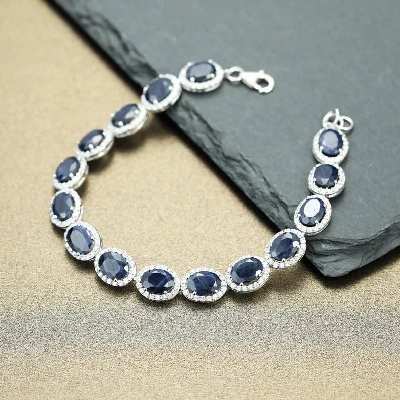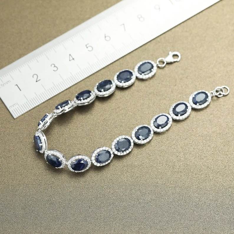 สร้อยข้อมือเทนนิสบลูแซฟไฟร์ชุบโรเดียมเงิน925สเตอลิงดีไซน์โดดเด่นของขวัญสำหรับผู้หญิงประดับหินแซฟไฟร์