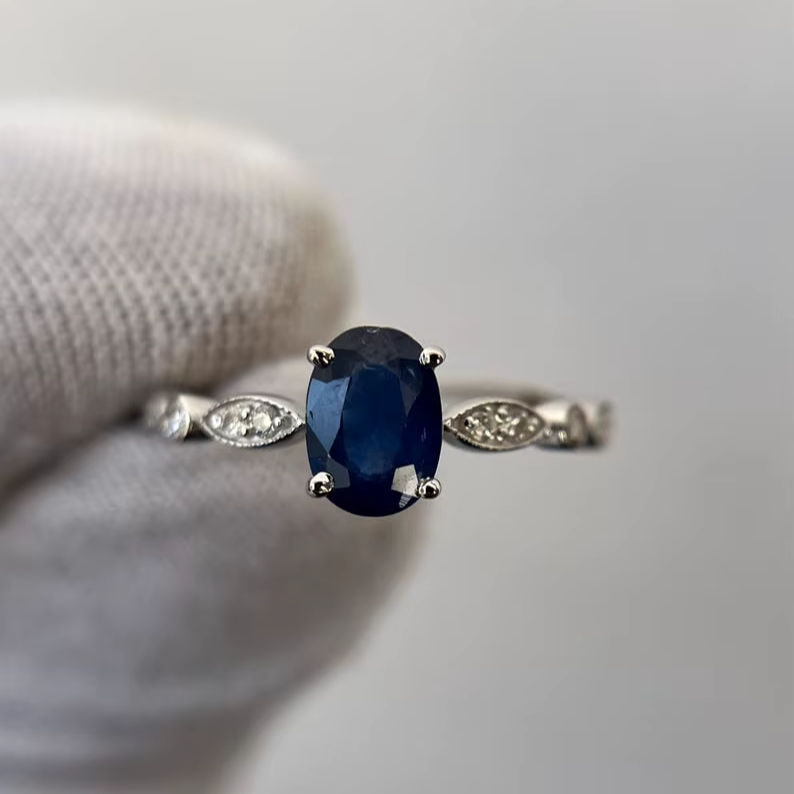 แหวนแต่งงานไพลินสีน้ำเงิน แหวนไพลินสีน้ำเงินธรรมชาติ พร้อมแหวนหมั้นและแหวนครบรอบสำหรับเธอ