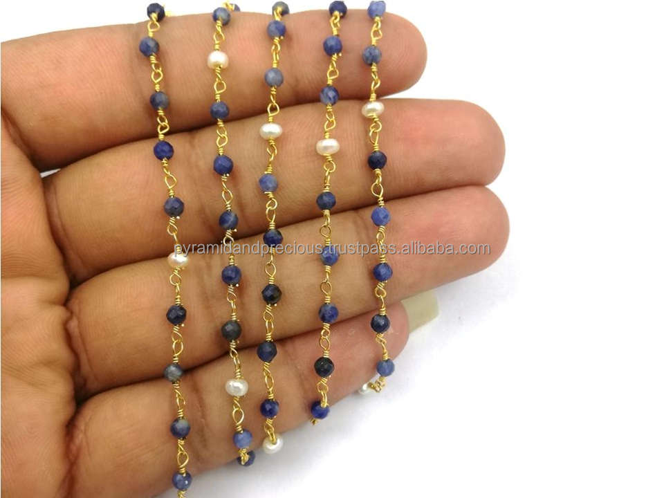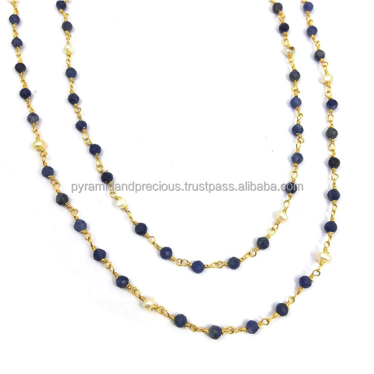 สร้อยประคำพลอยไพลินสีน้ำเงินและมุก ประดับด้วยลูกปัดทองเหลืองชุบทอง ขนาด 3 มม.-3.5 มม.